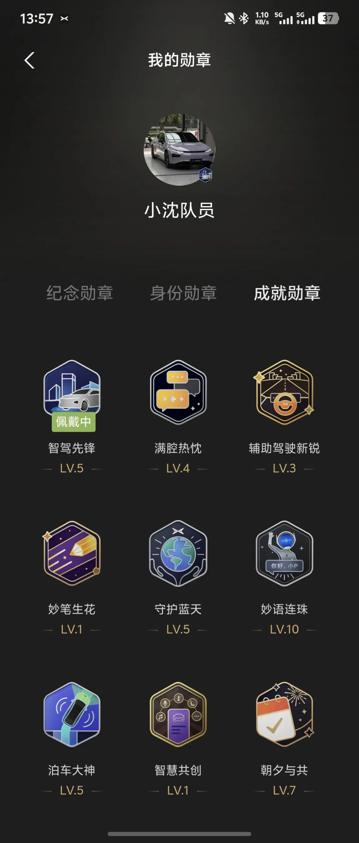 成就勋章里,妙语连珠LV.10是我的骄傲,这是无数次与小P语音交互的默契见证;智驾先锋LV.5和泊车大神LV.5,记录着我在智驾路上的每一次探索与成长,从城市NGP到自动泊车,小P总能给我满满的安全感。身份勋章里的充电领航V3,则是我作为鹏友,积极参与补能生态的小小印记。