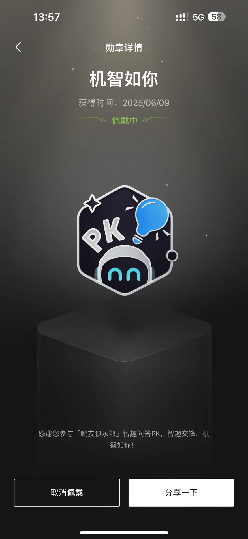 提车马上快一年了,目前一共收集了16个勋章,现在佩戴的这个机智如你勋章是我最喜欢的,是我之前参加智趣问答得到的,还收到了实体一摸一样的勋章。