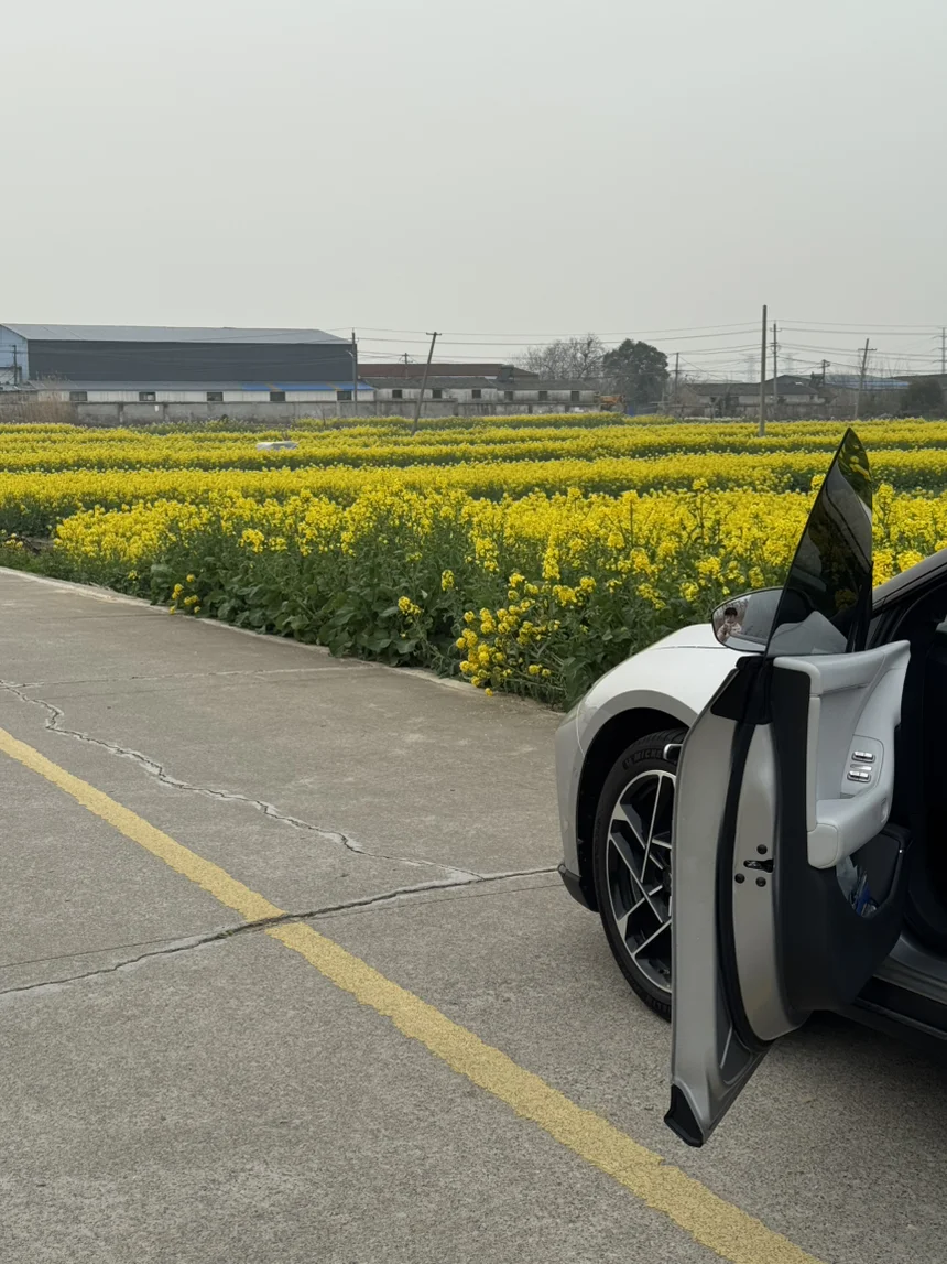 风轻轻吹过,花田晃啊晃,阳光落在身上暖乎乎的,车里安安静静,只有外面偶尔的鸟叫声。没有城市的喧嚣,没有琐事的烦扰,就这么坐着发呆,看着这片治愈的黄色花海,整个人都松弛下来。