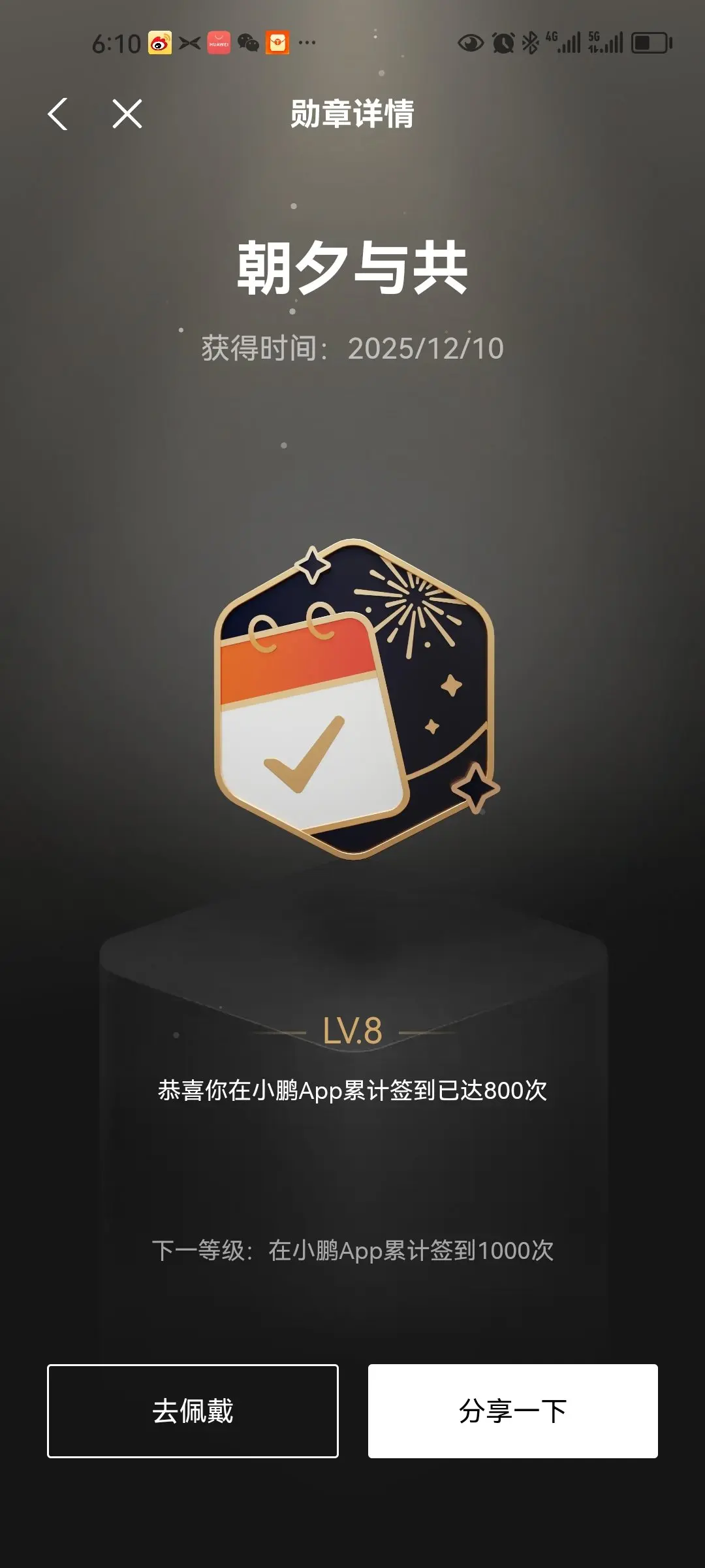 #晒晒我的勋章# 目前等级最高的就是这个朝夕与共勋章了,自从买了车之后就坚持每天都签到,一开始还有积分嘛,后面就没有积分了,就积极性没那么高,佛系签到。这次为了发这个帖子,特意去看了勋章库,才发现原来小p已经陪伴我超过八百天了