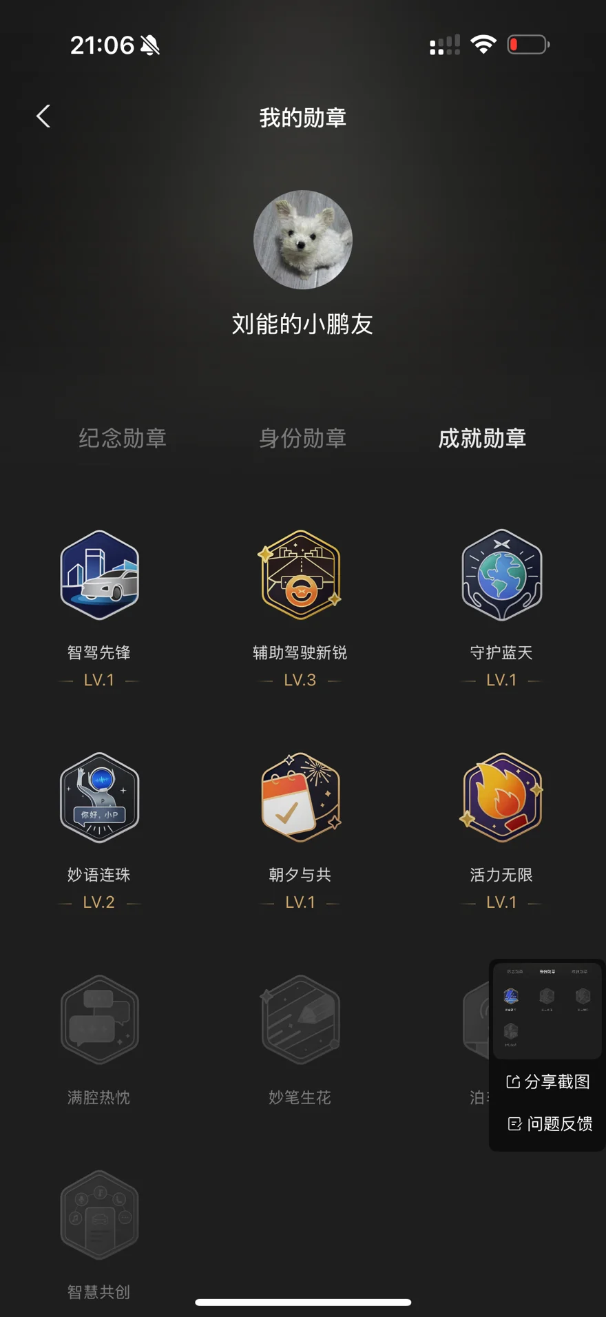 比较遗憾的是 好多限时勋章没有得到 刚提车的时候也不知道app有那么多的可玩性 包括人车互动会有得到能被认可或者纪念意义的勋章奖励😭