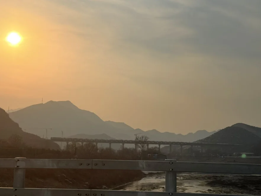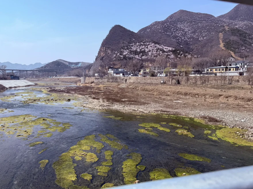 山上的桃花,远处的火车,河水中的小鸟!煮一壶好茶!