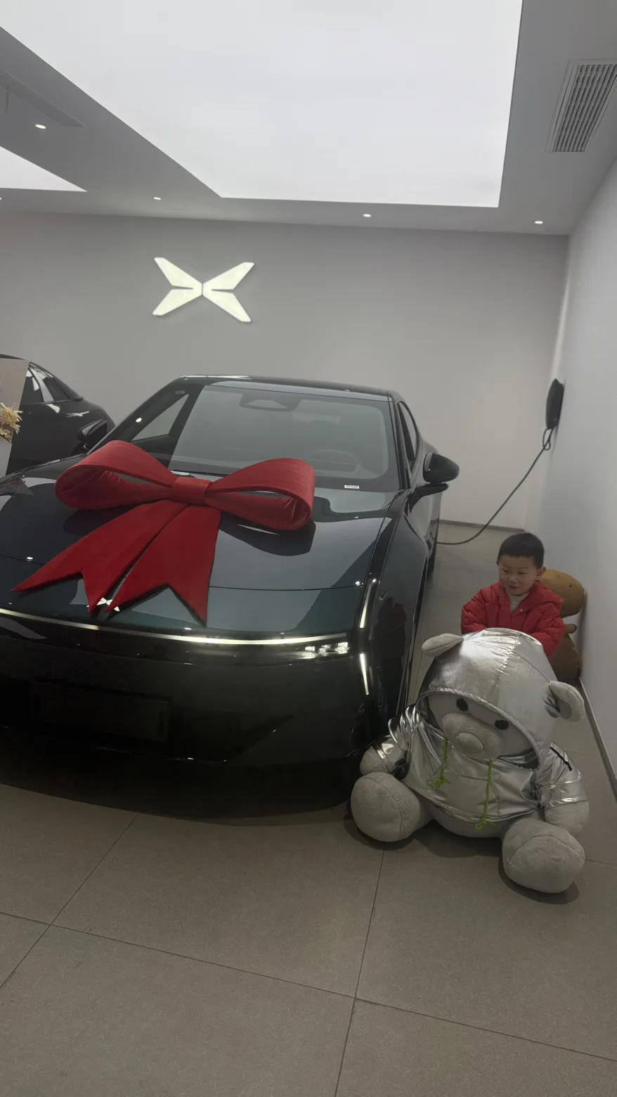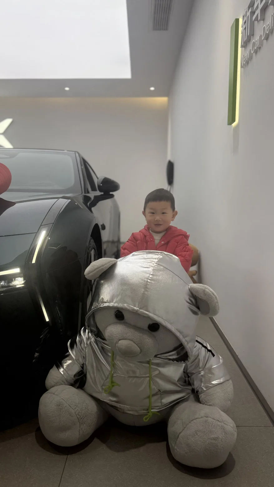 他一会儿摸摸光滑的车身,一会儿趴在车窗上往里面瞅,还拉着旁边的太空熊玩偶说:“熊熊,我们有新车啦!” 快门按下的瞬间,他笑得眼睛都弯成了月牙,比车头上的蝴蝶结还要耀眼。