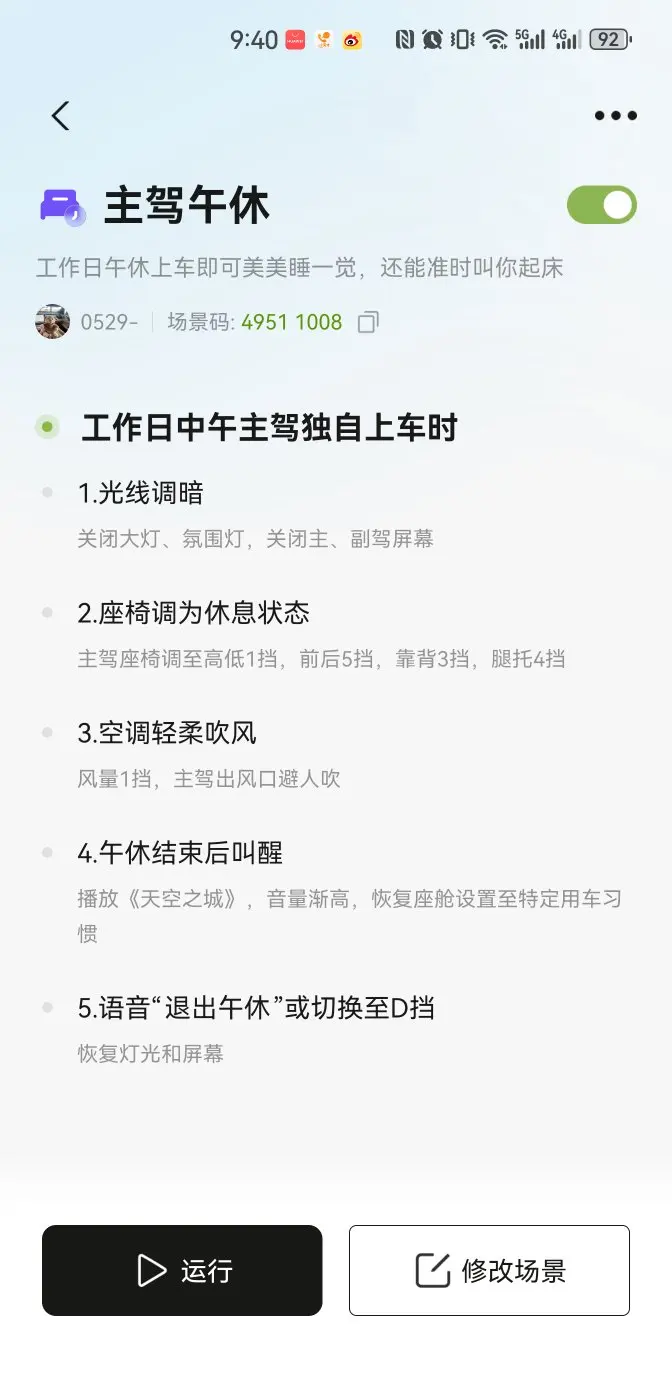 偷偷告诉你们,用那个 “主驾午休”智能场景码,设置好之后,上车一键就能进入躺平模式,到点还有温柔叫醒服务,打工人的午休幸福指数飙升!