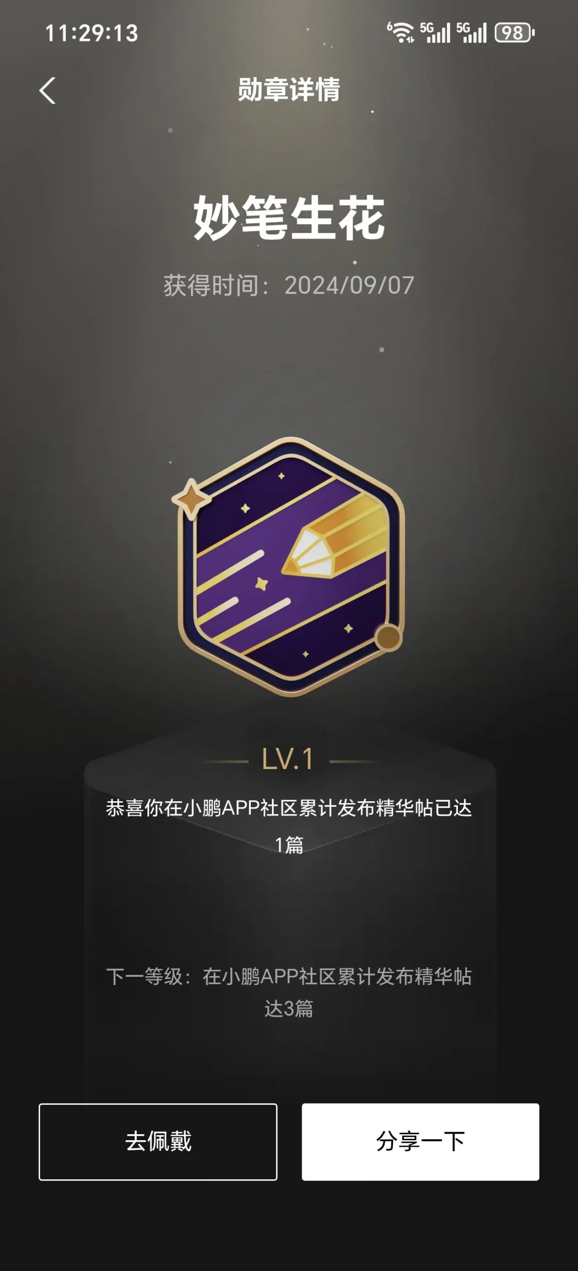 「妙笔生花」「满腔热忱」是社区里的温度,一篇精华帖、数十次评论,让我在鹏友圈找到同好;「十年热爱」「守护蓝天」「秋日鉴赏家」则是与品牌共同成长的印记,从百万台下线到绿色出行,每一步都充满自豪。