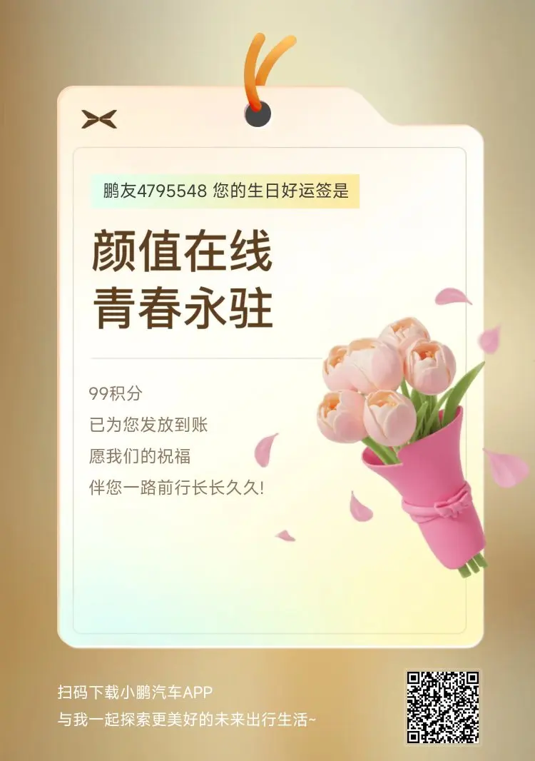 在生日这个美妙的日子,收到小彭的祝福,感到格外亲切和幸福。感谢小彭的陪伴,让我们便捷、安全和舒适。祝愿和期待小鹏的系统越来越完善自驾智博越来越科学高端,期待中哦。