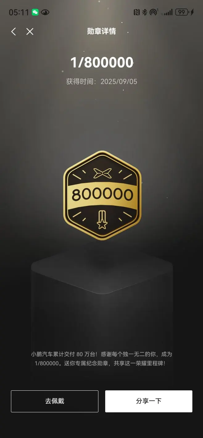 - 纪念勋章:「1/1000000」「1/800000」这两枚限定勋章,是我作为早期鹏友的专属印记;「2024年度勋章」则是对我过去一年与小鹏同行的最好纪念,每一枚都有着不可复制的纪念价值。