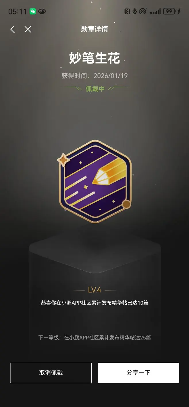目前我佩戴的是**「妙笔生花LV.4」**勋章,这也是我最钟爱的一枚。作为一名喜欢分享的鹏友,我总爱用文字记录和P7+的出行日常:阳江周边的短途自驾、带家人去珠海长隆的亲子之旅、开着P7+去广西云南的长途漫游,还有车辆的使用体验、功能技巧,都通过一篇篇帖子分享在小鹏社区。