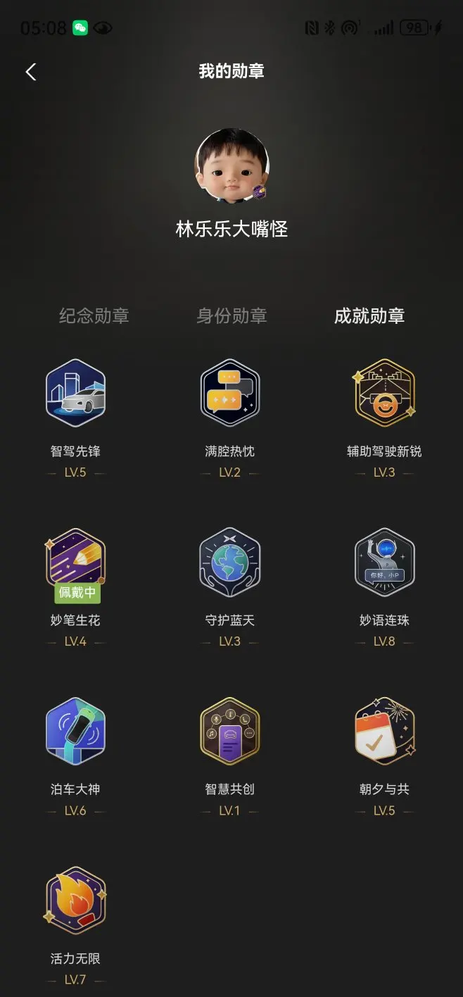 - 成就勋章:这是我最骄傲的部分!「妙语连珠LV.8」「活力无限LV.7」「泊车大神LV.6」「朝夕与共LV.5」「智驾先锋LV.5」「妙笔生花LV.4」……从社区活跃到用车技能,从陪伴时长到智驾体验,每一级升级都藏着我的用心。