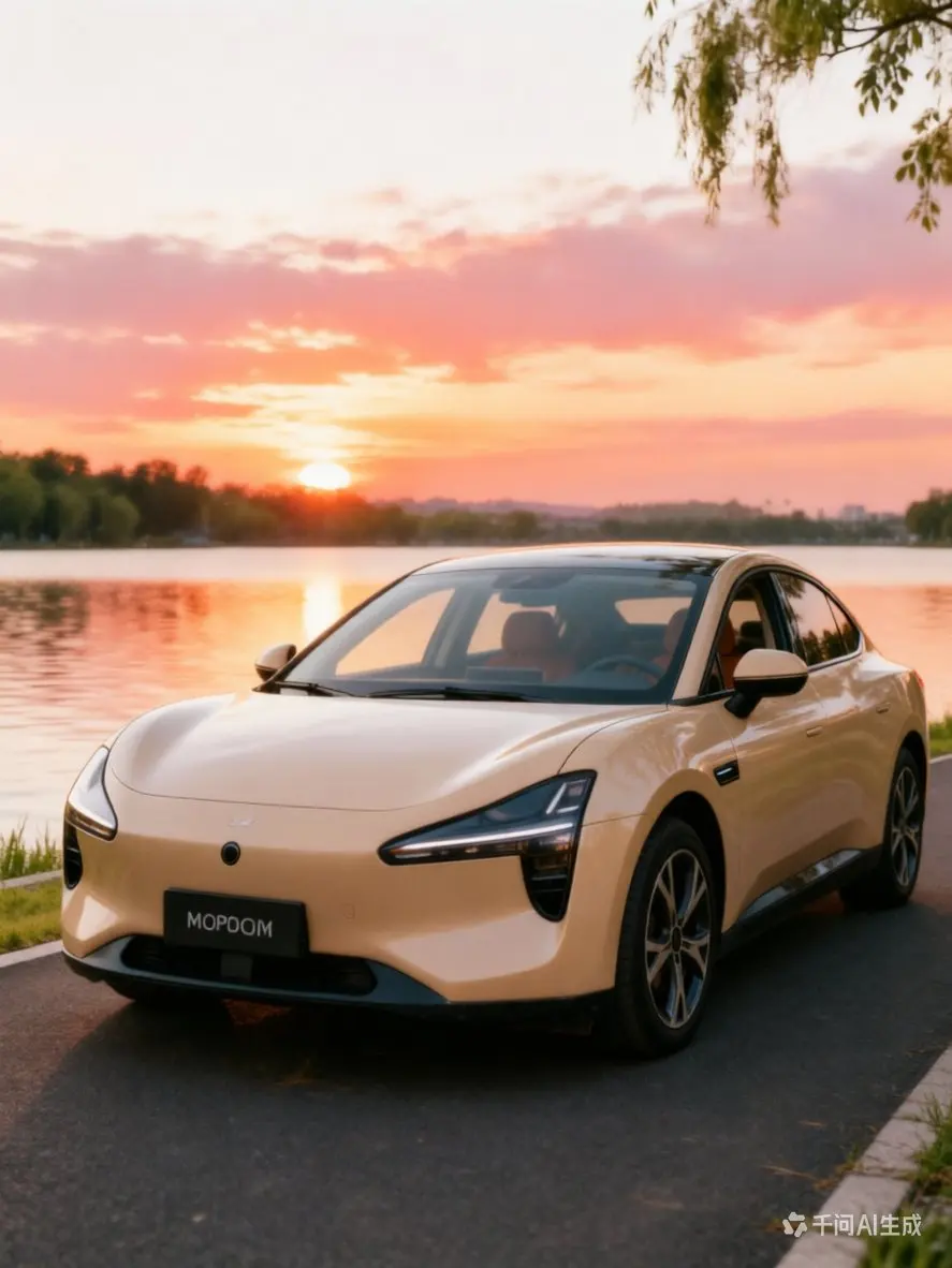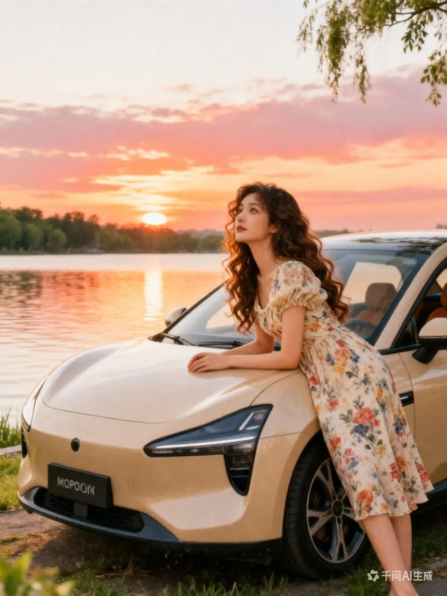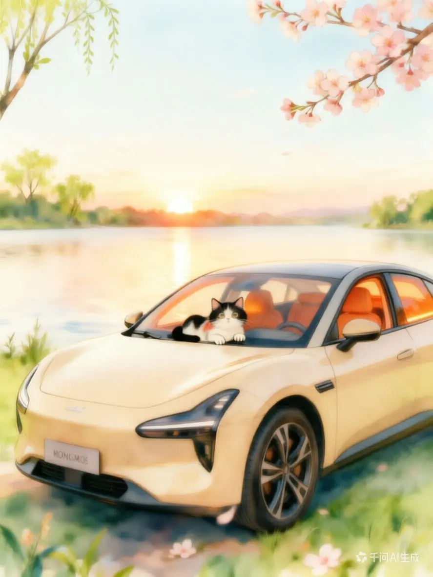 夏日黄昏,湖畔被晚霞染成温柔的橘粉色。我们开着小鹏MONA M03停在湖边,她抱着黑白小猫倚在车头,晚风拂过发梢,小猫慵懒地蹭着她的手。车内暖橙氛围灯亮起,与天边霞光相映,时光在这一刻变得格外治愈安逸。