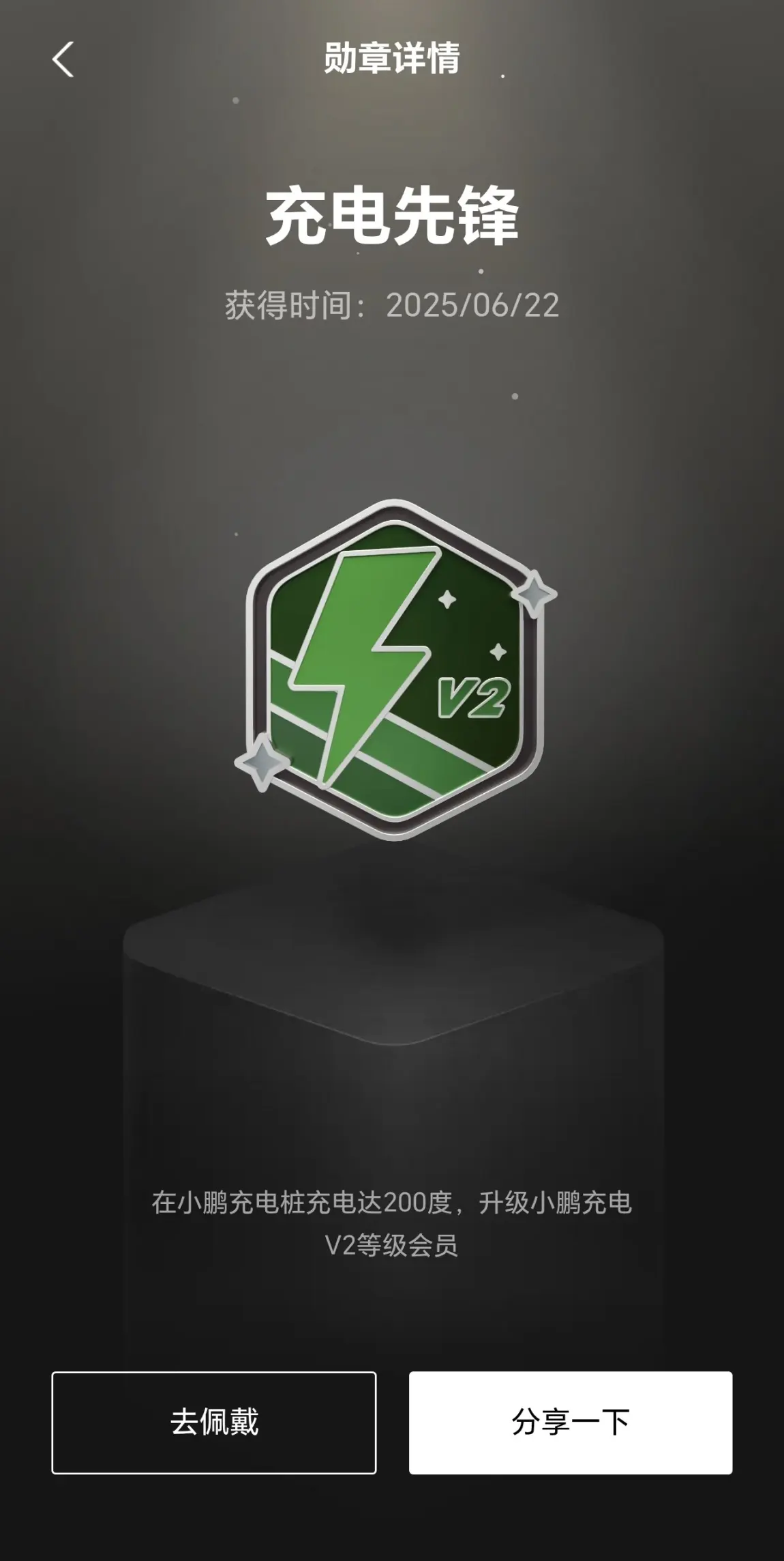 充电先锋勋章,在小鹏充电桩充电满200度,成为小鹏充电V2会员!