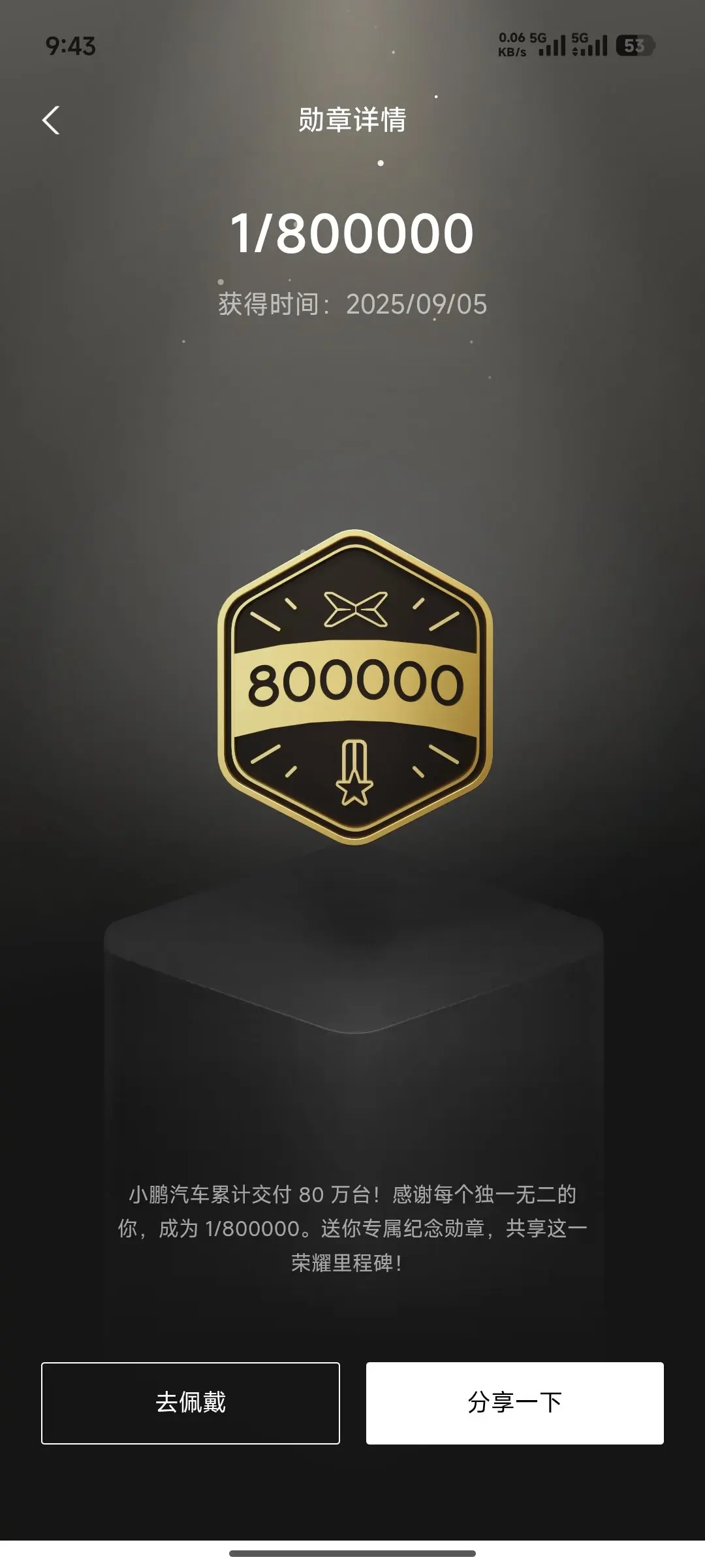 #晒晒我的勋章# 勋章一直是一种鹏友的象征,它能无形中给大家带来满足感,不知不觉也收集了十多个勋章,最印象深刻的还是这个80万分之一,2025年是小鹏汽车蓬勃发展的一年,不断有好消息传来,竟不知已经交付超过了80万台,可喜可贺,希望越来越多的鹏友加入我们!
