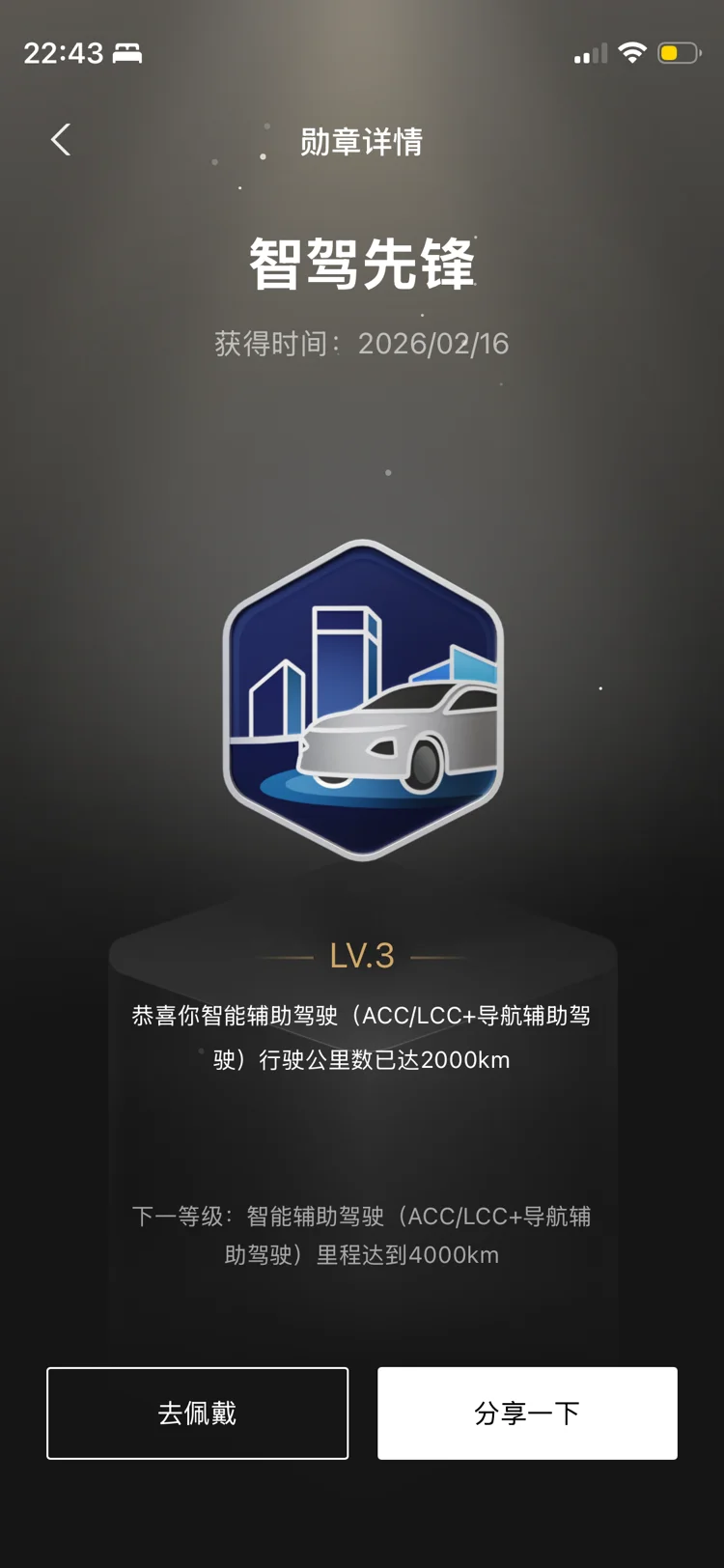 提车快一年了,不知不觉已经收集到16枚勋章,最开心的是逐渐学会了使用ngp,目前智驾里程也突破两千公里。非常开心。