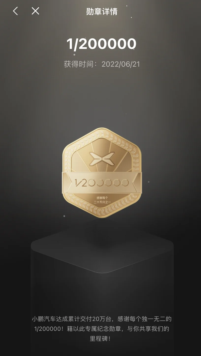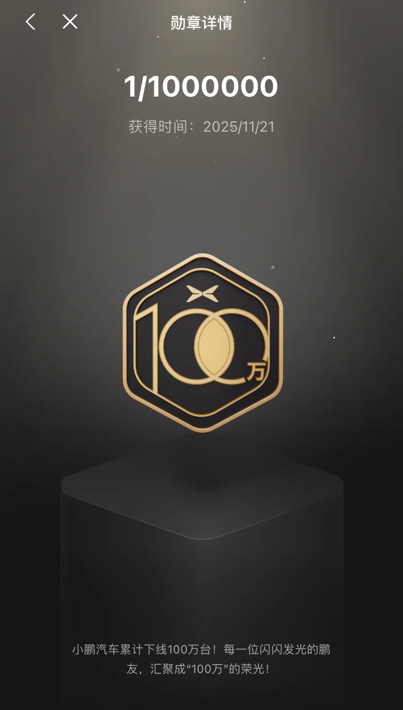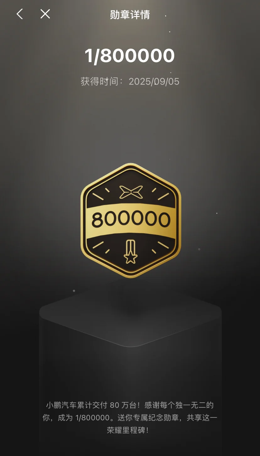 我的纪念勋章里,最耀眼的当属那几枚金色的里程碑徽章。2022年6月21日,我收获了「1/200000」勋章,彼时小鹏汽车累计交付20万台,我有幸成为这二十万分之一,见证品牌迈出重要一步;2025年9月5日,「1/800000」勋章如约而至,交付量突破80万台,品牌的成长速度令人惊叹;同年11月21日,「1/1000000」勋章闪耀登场,百万下线的荣光里,也有我的一份参与。