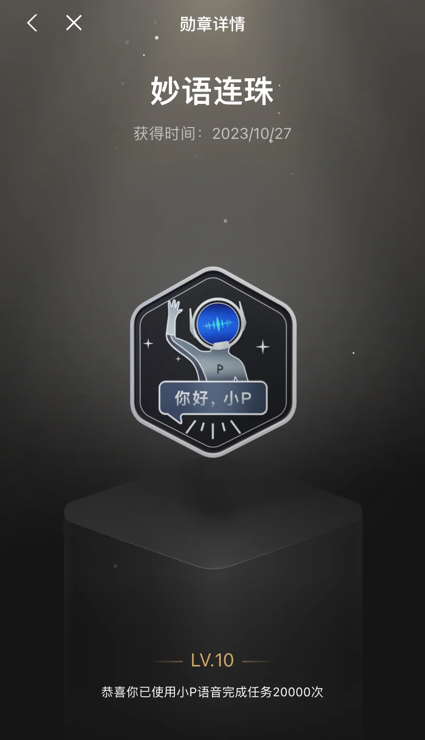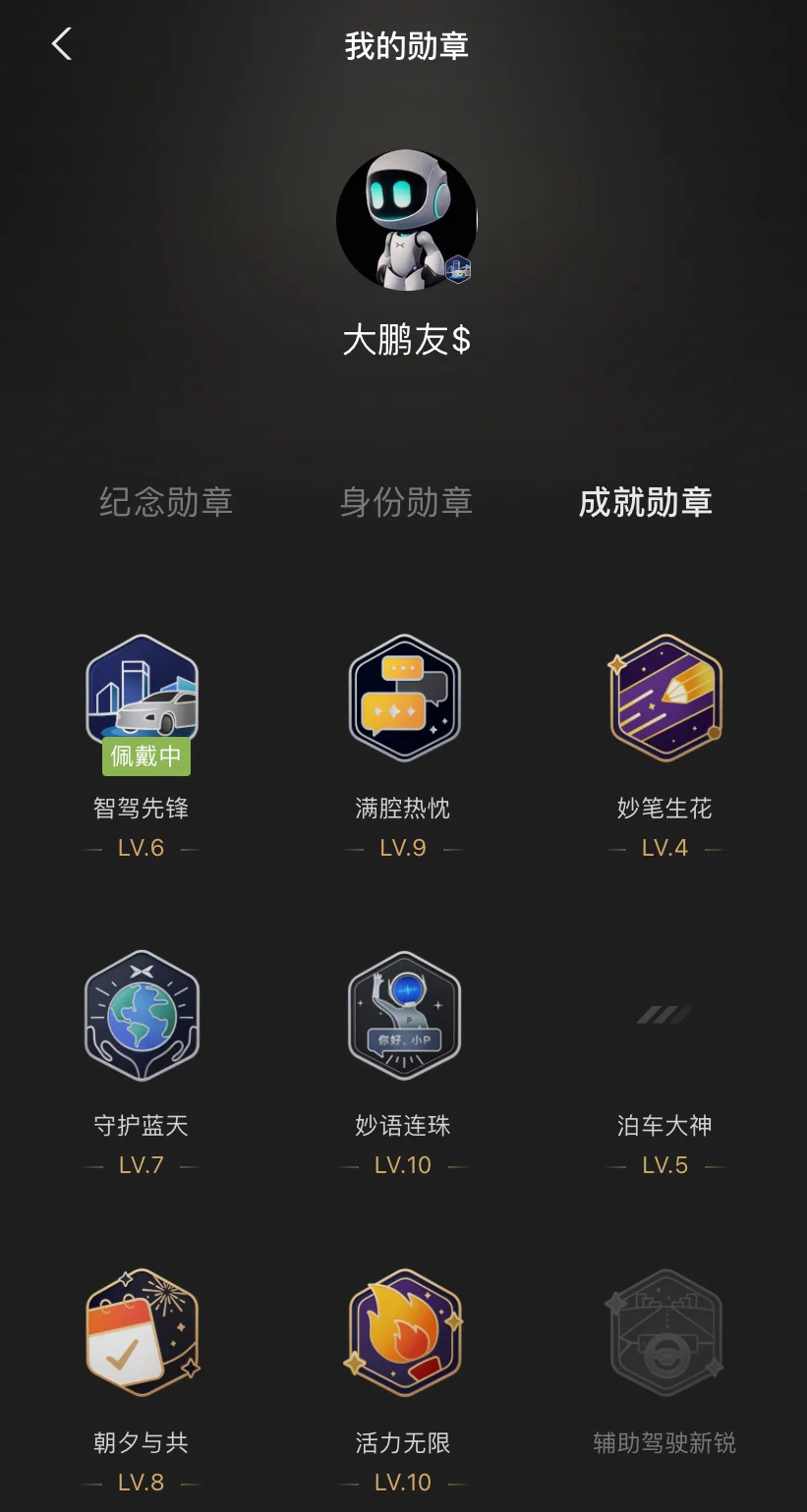 🟢「妙语连珠」LV.10勋章格外有趣,20000次与小P的语音互动,从「你好,小P,导航回家」到「你好,小P,打开空调」,小P早已成为出行路上的贴心伙伴,偶尔的趣味对话还能化解旅途的疲惫;「满腔热忱」LV.9、「妙笔生花」LV.4、「守护蓝天」LV.7、「朝夕与共」LV.8、「泊车大神」LV.5、「辅助驾驶新锐」,每一枚都对应着不同的用车场景——认真分享用车感受、熟练掌握自动泊车、坚持绿色出行,这些日常小事,都被勋章悄悄记录。