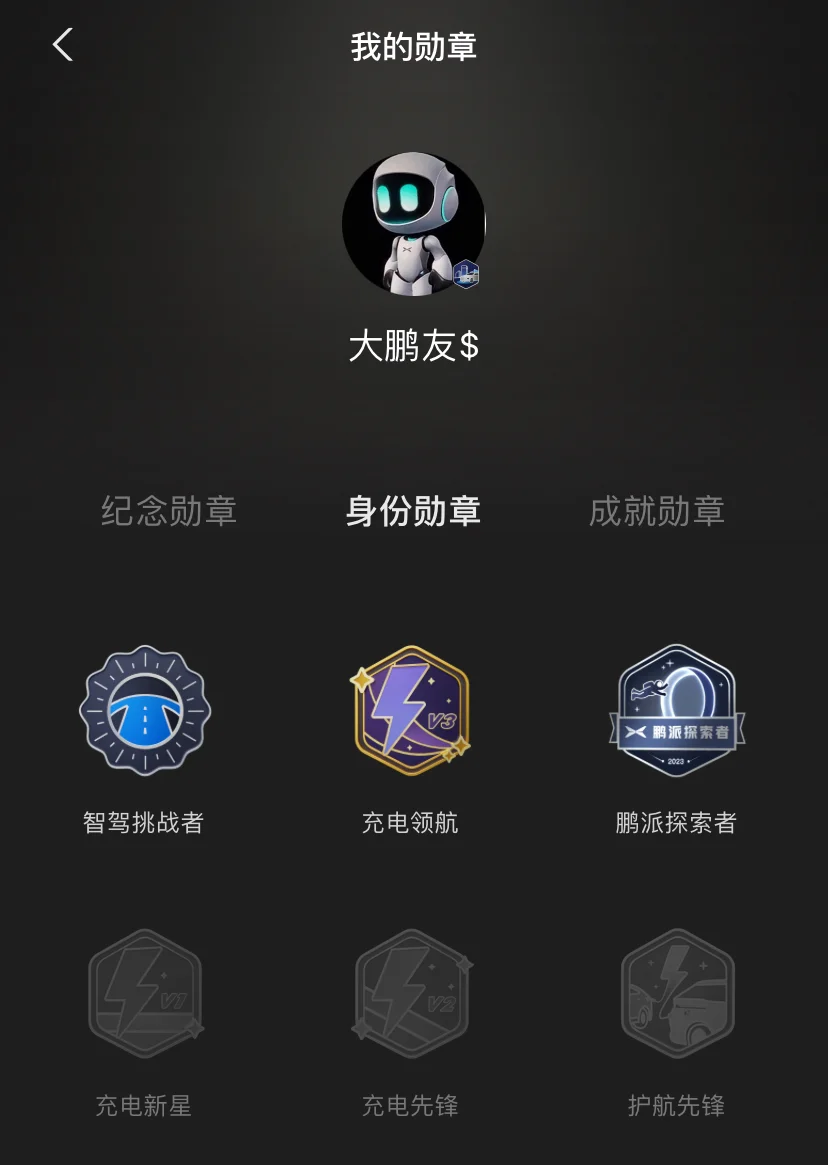 身份勋章是我的专属标签,每一枚都对应着用车生活里的独特体验。「智驾挑战者」是对探索智能驾驶的认可,「充电领航」「充电新星」「充电先锋」记录着我与小鹏超充站的无数次相遇,从初次尝试到熟练掌握,充电的便捷让出行更安心;「鹏派探索者」「护航先锋」则代表着我对小鹏品牌理念的认同,也藏着每一次自驾探索的勇气。