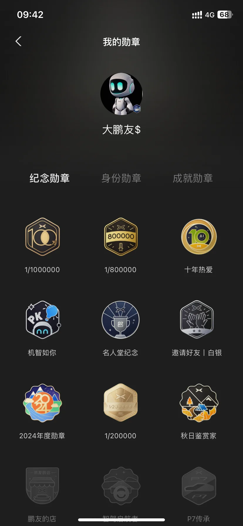 2️⃣还有「十年热爱」勋章:是对长久陪伴的嘉奖;「2024年度勋章」记录着过去一年的用车时光;「名人堂纪念」「秋日鉴赏家」「机智如你」「邀请好友|白银」,每一枚都串联起与鹏友们互动、参与活动的美好瞬间,让品牌的温暖藏在细节里。