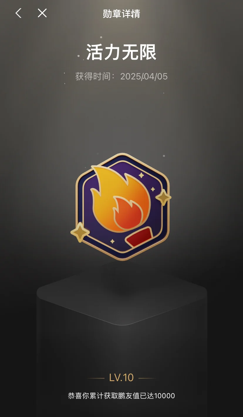 🟢「活力无限」LV.10勋章,是累计10000鹏友值的见证,日常打卡、参与活动、分享用车体验,不知不觉就攒满了活力,也收获了满满的参与感。