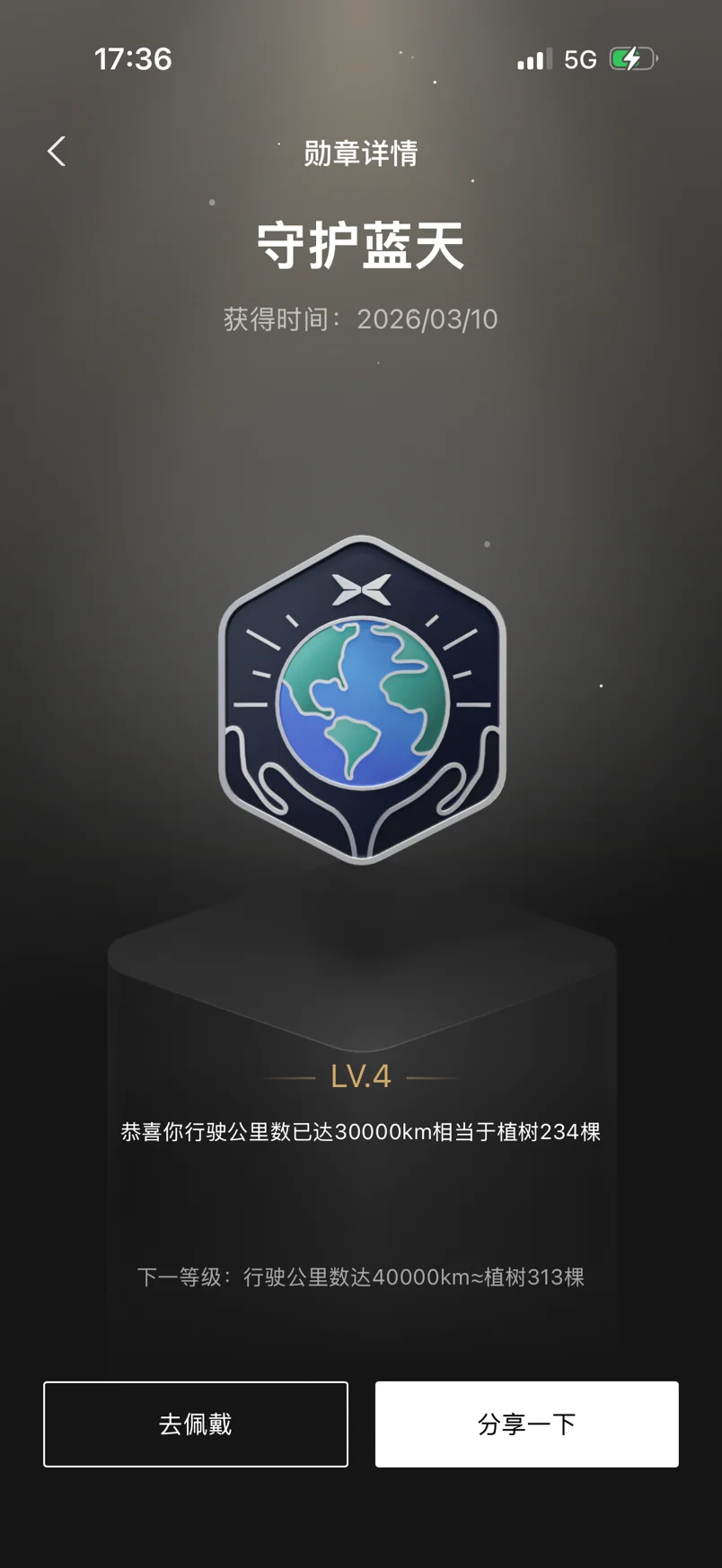 #晒晒我的勋章# 解锁守护蓝天四级✅一年30000+公里纯电出行,零排放、低能耗,默默为蓝天减负。系统记录,这一年的减排量相当于种下234棵树,每段路程都有环保意义。很开心以这种方式参与低碳生活,智能出行与绿色守护并行。未来继续和小鹏一起,用纯电守护晴空,让每一次出发都更有价值🌍
