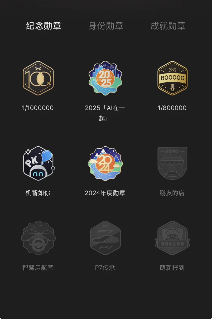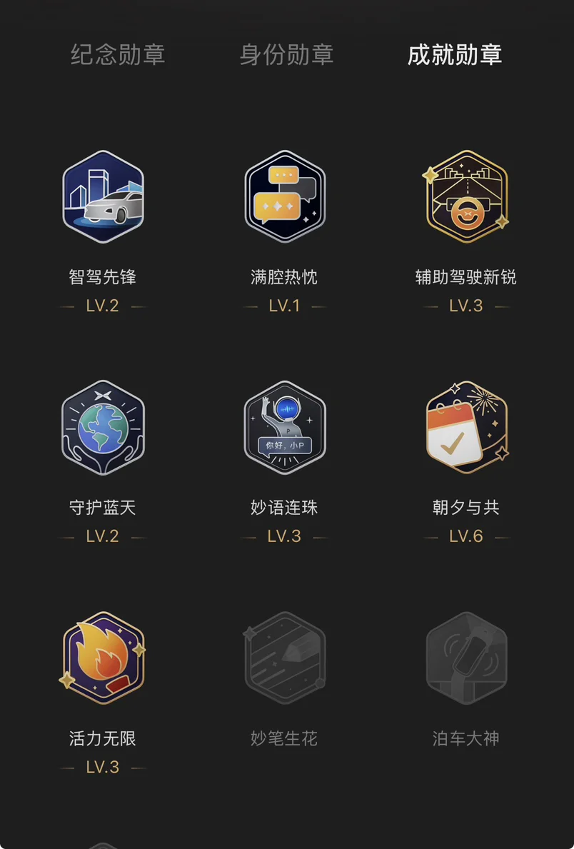 虽然只有13个勋章但是都很漂亮,也很有仪式感,我最喜欢辅助驾驶的勋章,小鹏车的辅助驾驶全球一流!