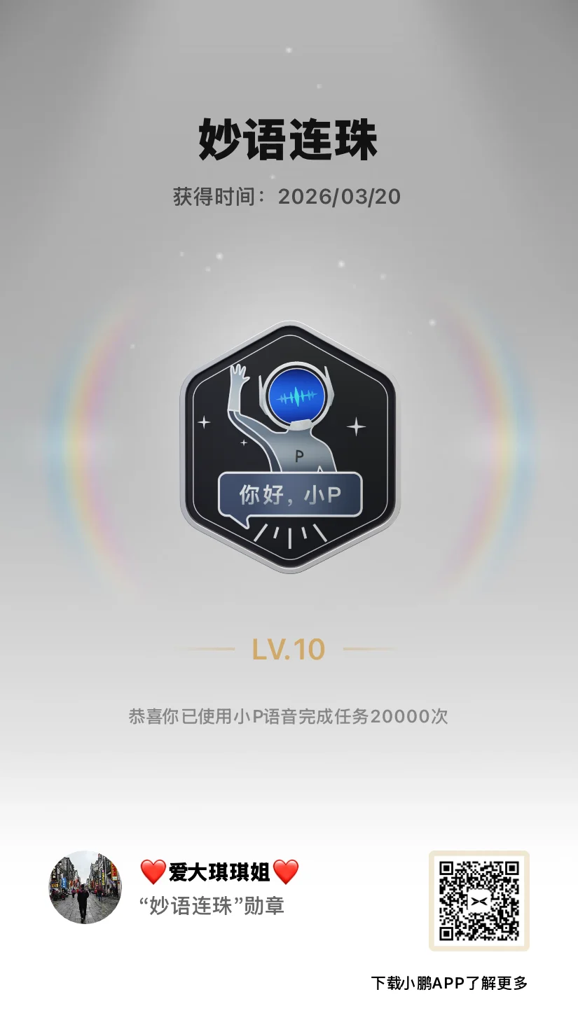 半年已经收集的勋章,很有纪念意义,第一个1/1000000,100万里的一份子,很荣幸。前天获得的最新勋章,20000次语音对话,使用小p,越来越喜欢
