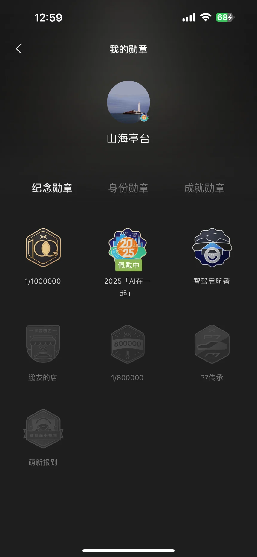 #晒晒我的勋章# 作为小鹏G6车主,已解锁14枚勋章,最爱智驾先锋、充电领航与妙语连珠,是智驾、补能与座舱体验的最佳见证!当前佩戴2025「AI在一起」纪念章,定格年度AI出行记忆。期待车型传承等限定勋章返场,也盼勋章绑定更多专属权益,让每一枚都成为小鹏车主的专属荣耀!