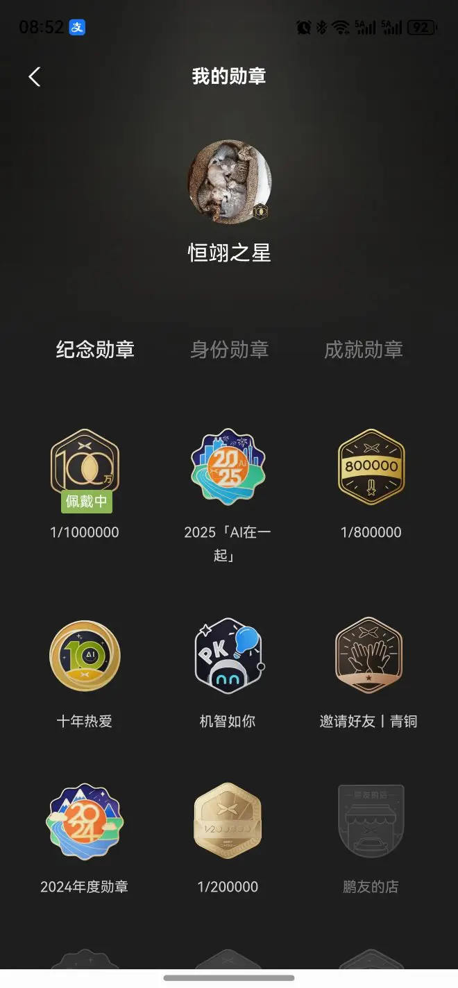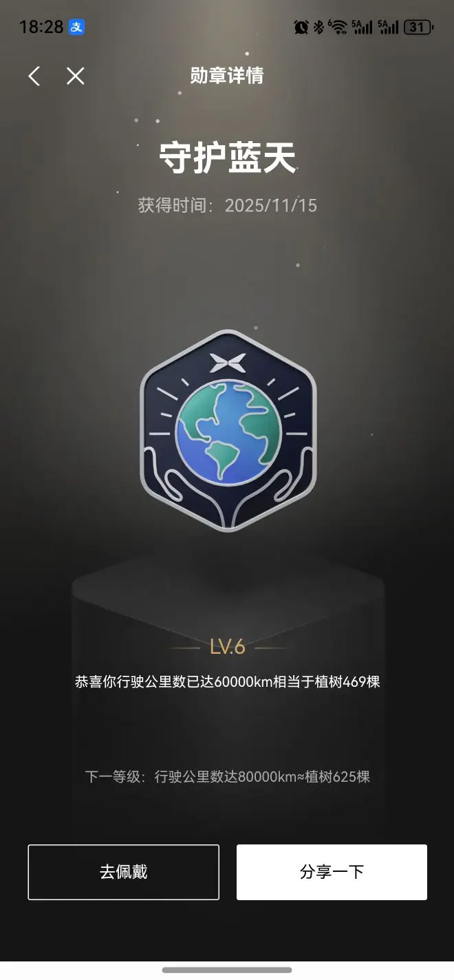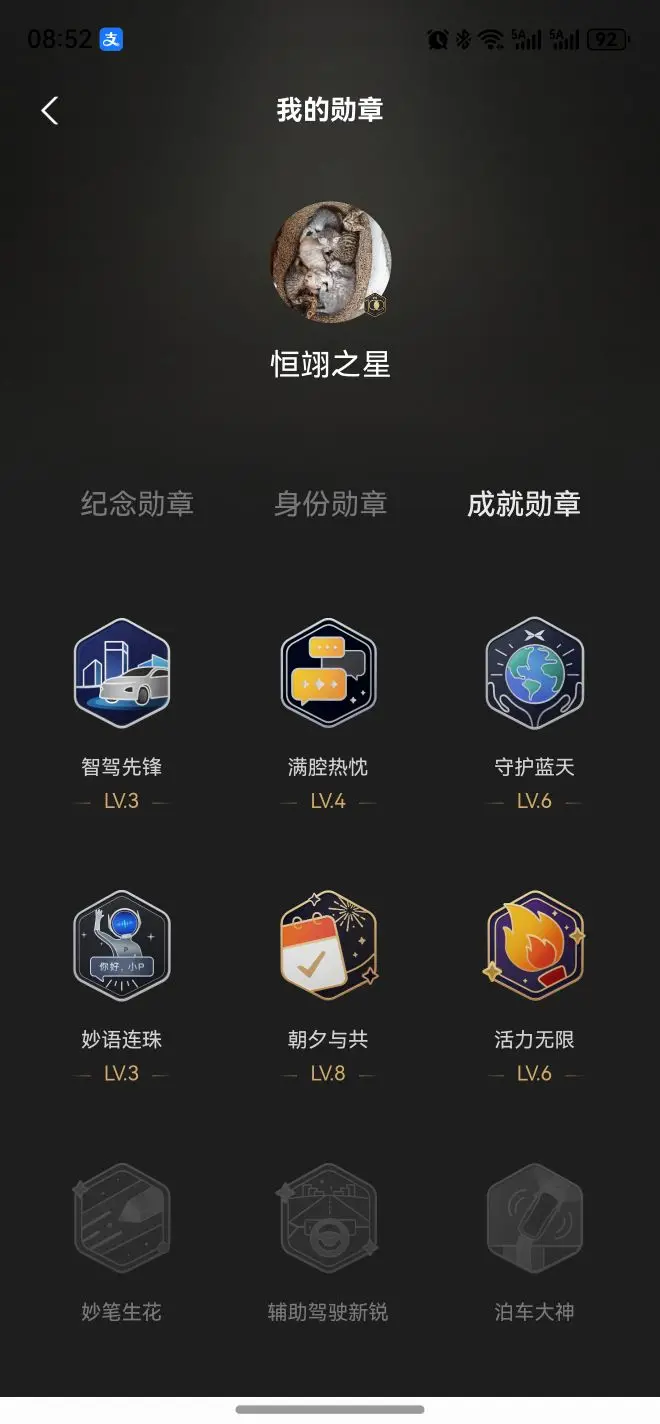 #晒晒我的勋章# 我现在一共有17枚勋章,佩戴的是100万分之一的纪念勋章,从20万分之一到见证小鹏交付量突破100万,很有纪念意义。作为纯电车主,我比较喜欢守护蓝天勋章,纪念我驾驶里程已过6万公里,减少了碳排放,为保护蓝天出一份力。