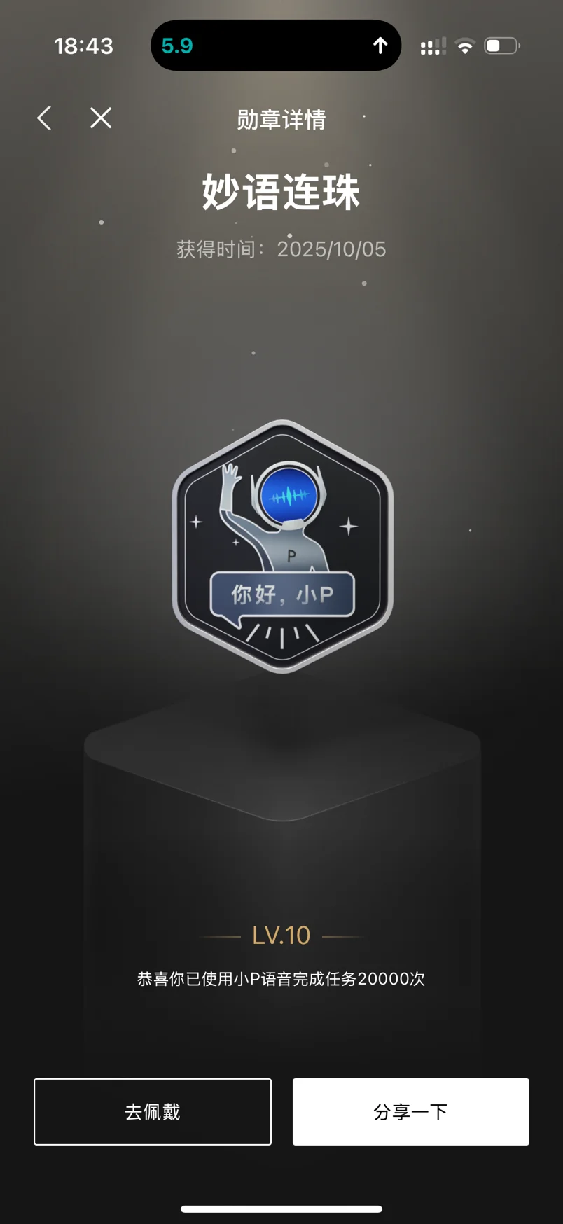 使用小鹏的车子快3年了,一共得到了19个勋章,其中等级最高的勋章就是妙语连珠,已经使用小P语音2万次了,哈哈