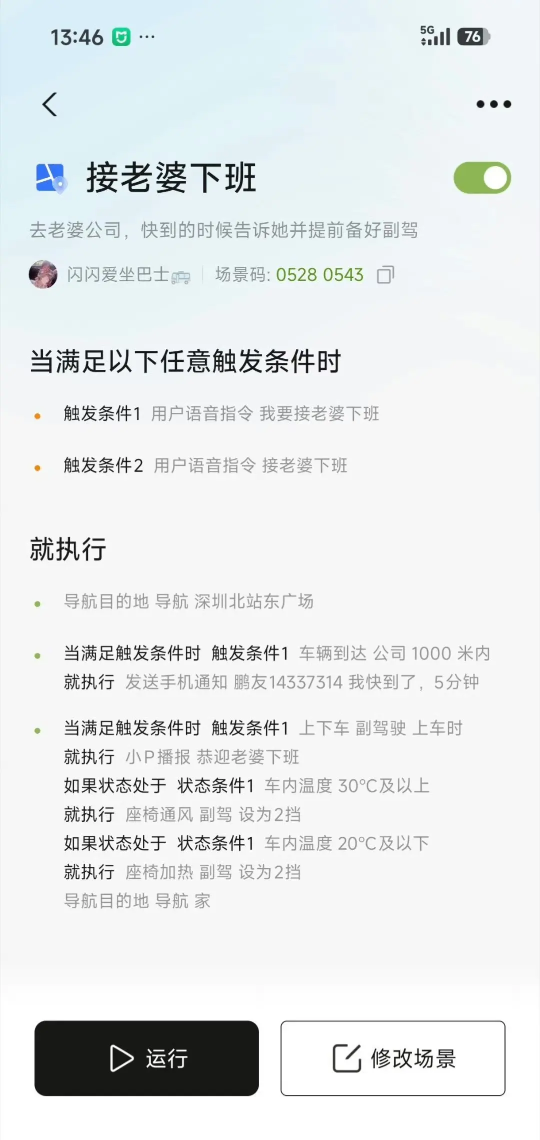 接人下班场景码:05280543;进入小鹏App,智慧场景搜索即可查看,哄人必备