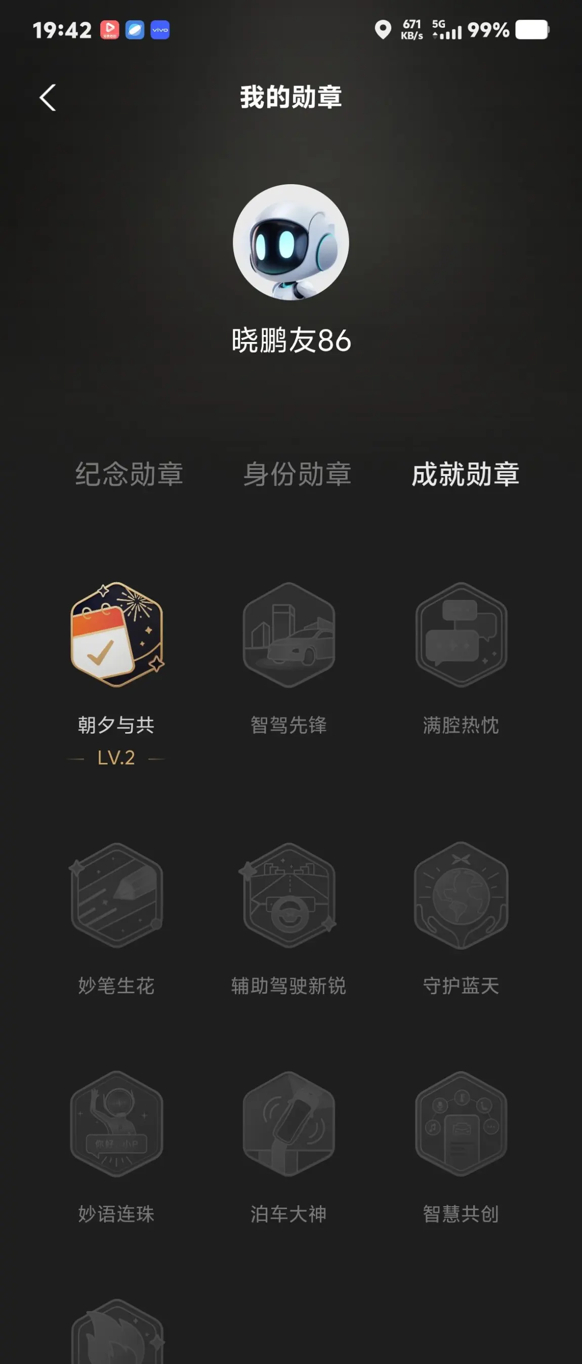 #晒晒我的勋章# 很遗憾的是我只领到了一枚勋章,一直在关注小鹏汽车的智能方面感叹小鹏汽车科技的发展非常的迅速,智能驾驶的发展也非常的迅速,包括他造的车的造型。也好,实际操纵也好,都非常的棒。所以一直很喜欢小鹏汽车,但是目前还没有购买,所以只收集到了一个徽章!以后我会加强互动,多和大家分享一下看车的心路历程!多和大家分享购车的体验,希望可以尽快成为尊贵的小鹏车主!