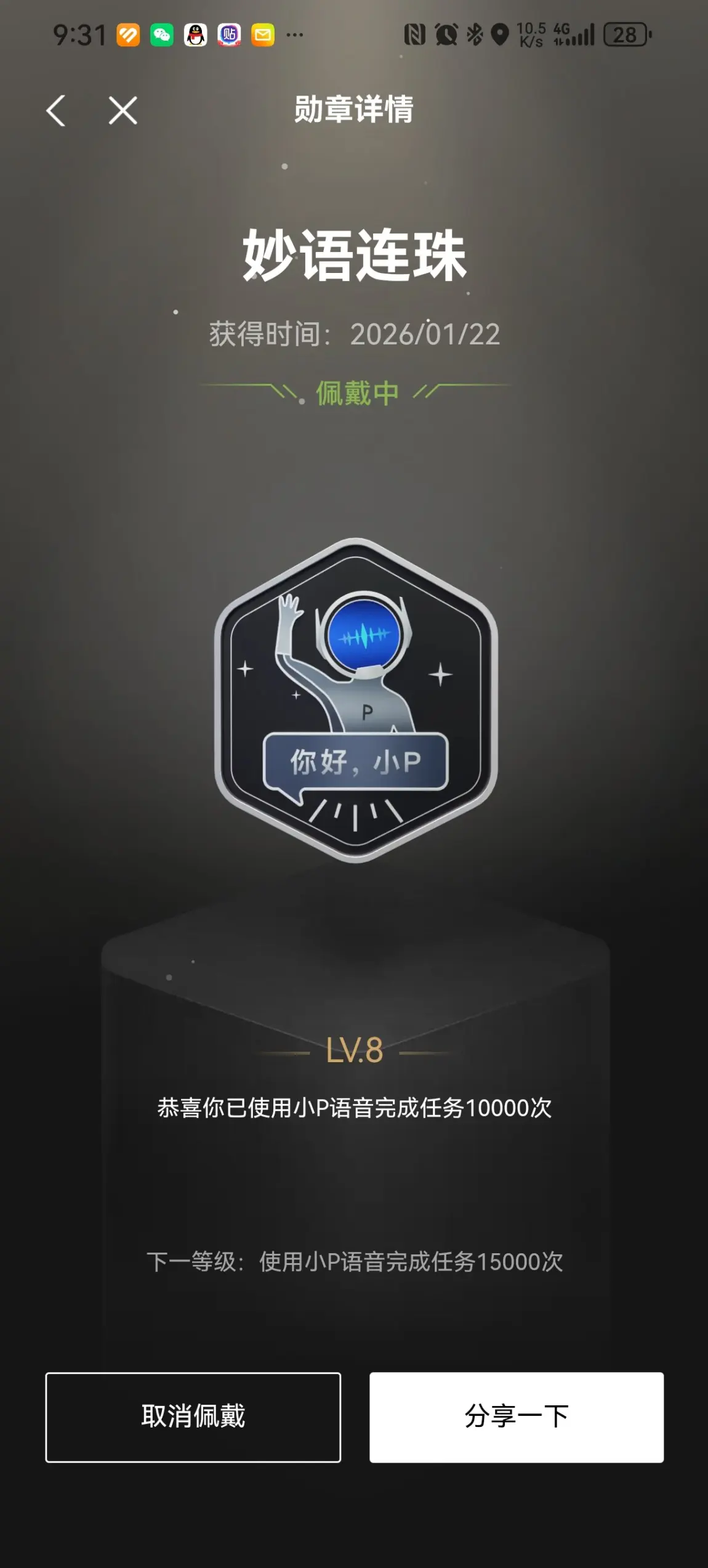 #晒晒我的勋章# 我的勋章总是在某天打开APP就突然收到了,我一看才知道原来还有这种成就哈哈哈。我最喜欢的勋章就是你好小P,跟小P聊天就没有那种和赛博智障对牛弹琴的感觉,过程非常的丝滑,所以使用的频率也高,嘿嘿。