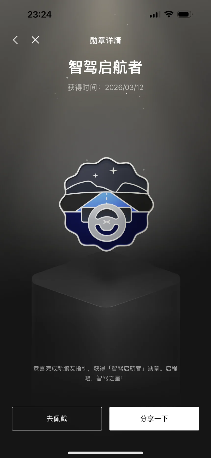 新鹏友报到!已经解锁3枚小鹏勋章啦✨「辅助驾驶新锐」正在佩戴中,见证我从新手到熟练用NGP的成长~还有「智驾启航者」和「充电新星」,每一枚都是和P7+的专属回忆!期待以后解锁更多勋章,记录和小鹏的每一段旅程~#晒晒我的勋章#
