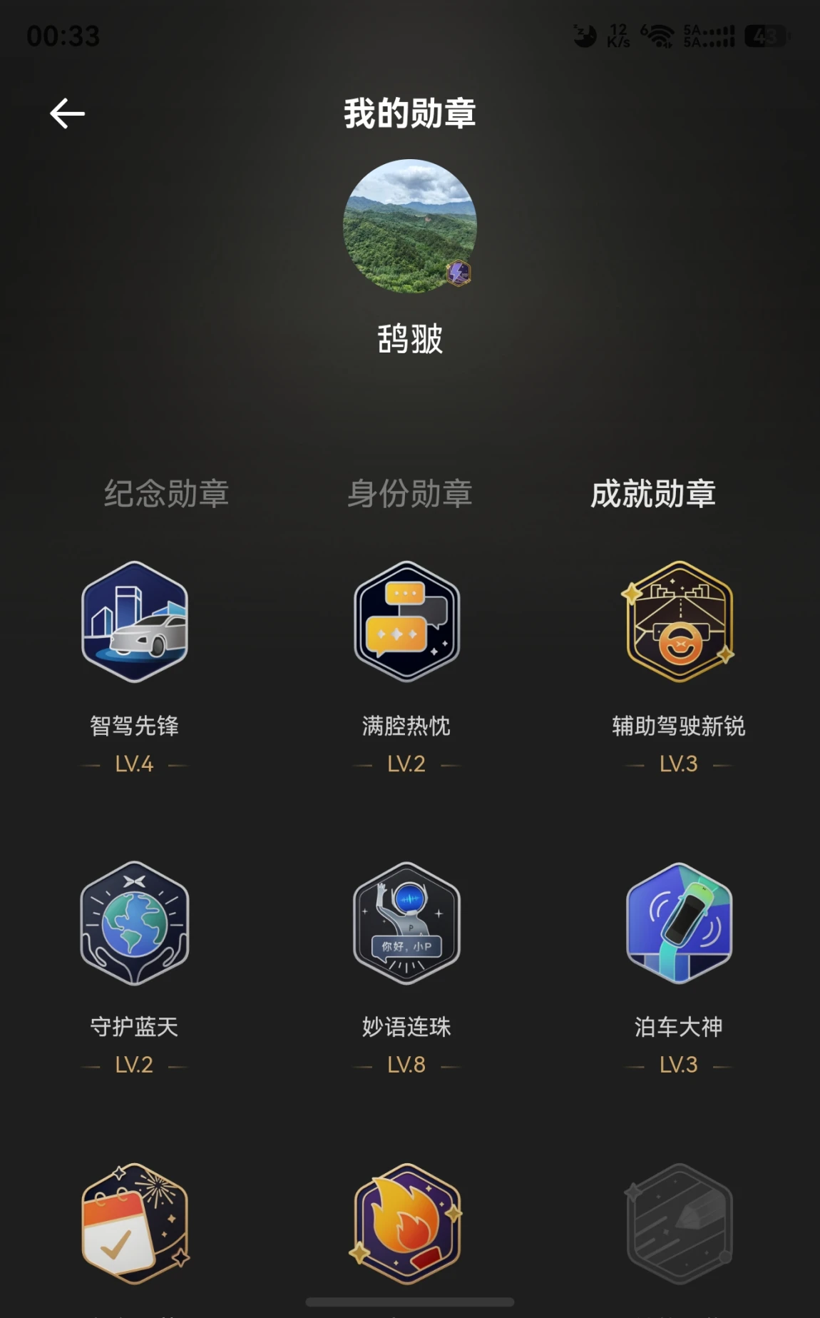 希望徽章多出一些,可以做一些诸如能耗管理大师(环境温度加权能耗最低前10%,按季度评比,但不容易搞公平)、刹车专家(平稳程度,就是传感器不一定能支持)、安全驾驶老死机(安全驾驶出险返修则归零,x年以上安全驾驶得)、走遍xx省(驾车抵达xx省所有地级市得)。