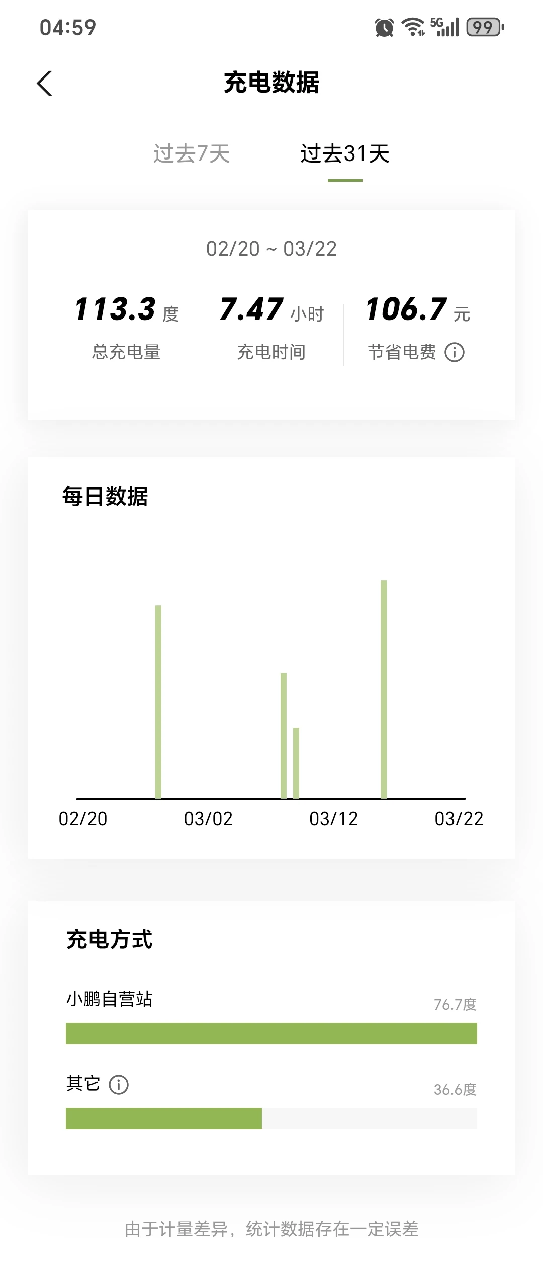春分节气,气温上升到15度以上。本月里程705km, 充过3次电,1次慢充,2次快充。