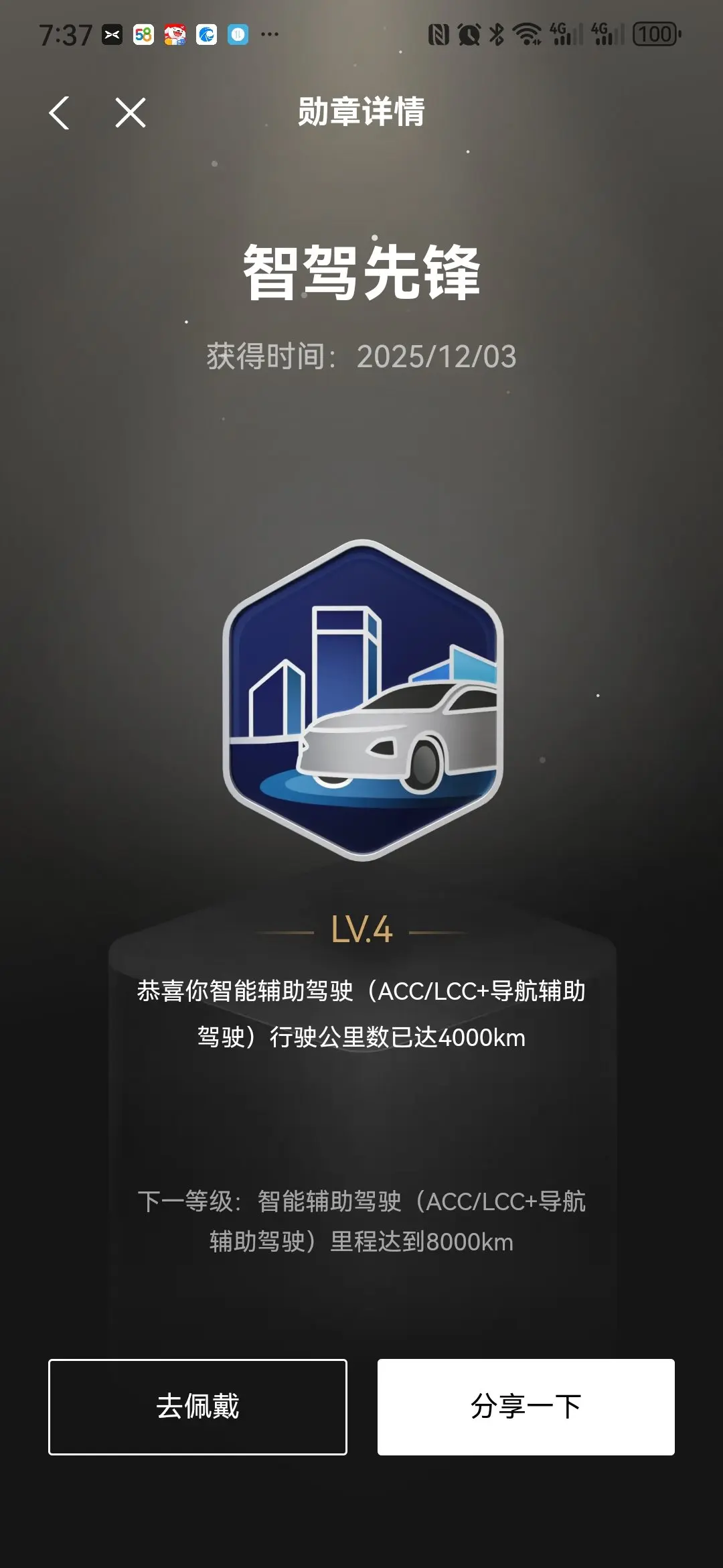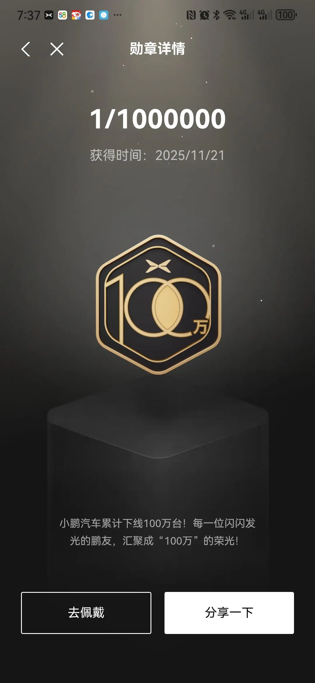 25年7月提车以来,已获得13枚勋章,小鹏的辅助驾驶现在使用频率越来越高,让我变得越来越懒了,安心感确实还不错。同时也见证了小鹏100万台车下线,祝愿小鹏越来越好!
