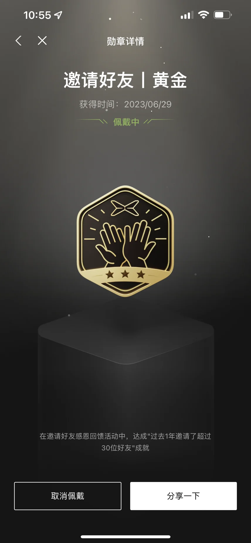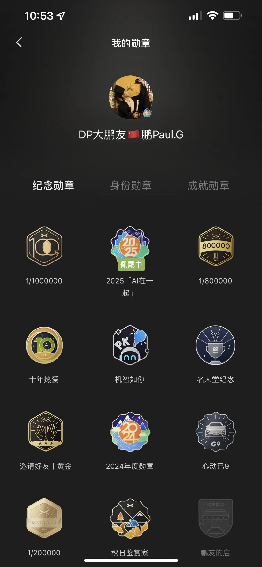 #晒晒我的勋章# 现在有25个勋章。正在佩戴的是邀请好友的黄金勋章。佩戴了这个才想起那年邀请了这么多鹏友。希望萌新车主报到可以返场给老车主重新经历一次,因为我们成为新车主时没有这个勋章。还有希望推出百万分之一车主勋章。