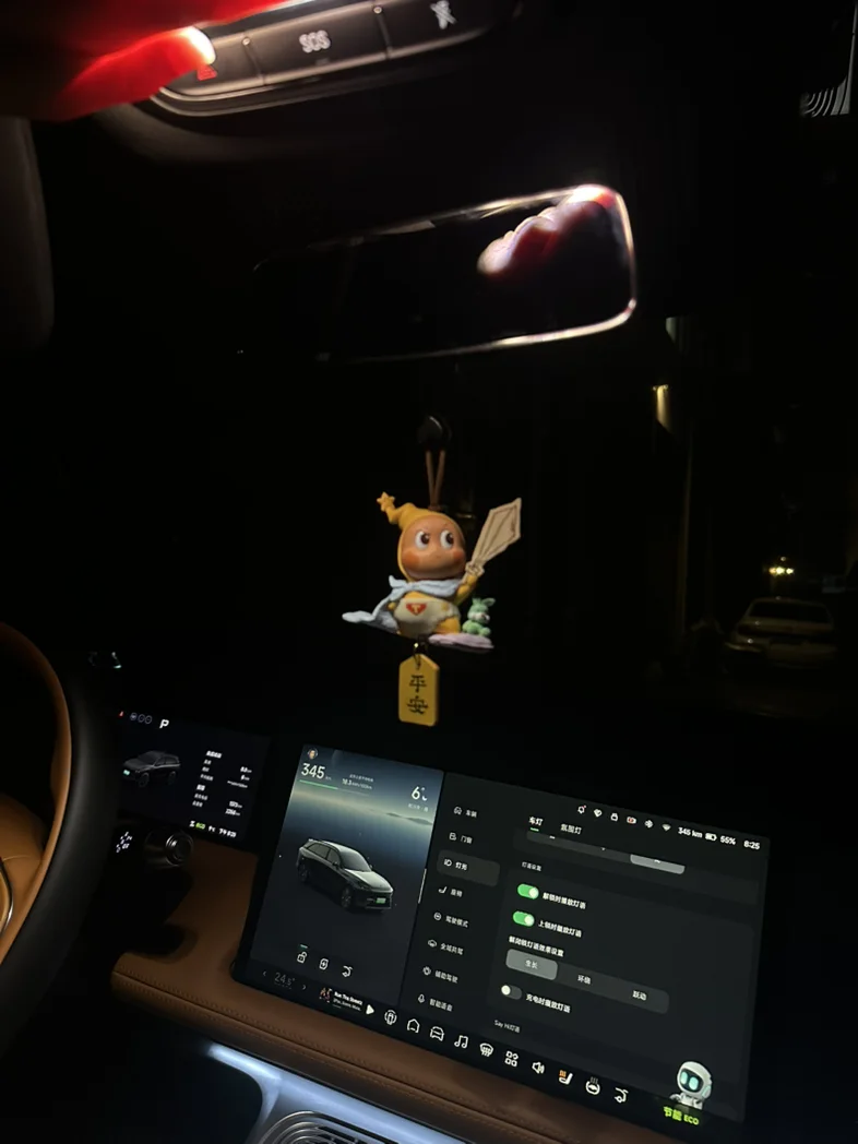 把氛围灯调到最柔的蓝色,摸一摸那只挂了很久的星星人小挂件,就这么安安静静坐着,连呼吸都慢下来。有时候会盯着后视镜里路过的外卖小哥、晚归的行人,看他们披着夜色匆匆赶路,突然就觉得,大家都在好好生活呢。推开车门,我是要做饭、要照顾家人的大人;关上车门,我才是那个可以发呆、可以偷懒、可以只属于自己的小孩。这10分钟,不是拖延,是我给自己留的温柔缓冲。