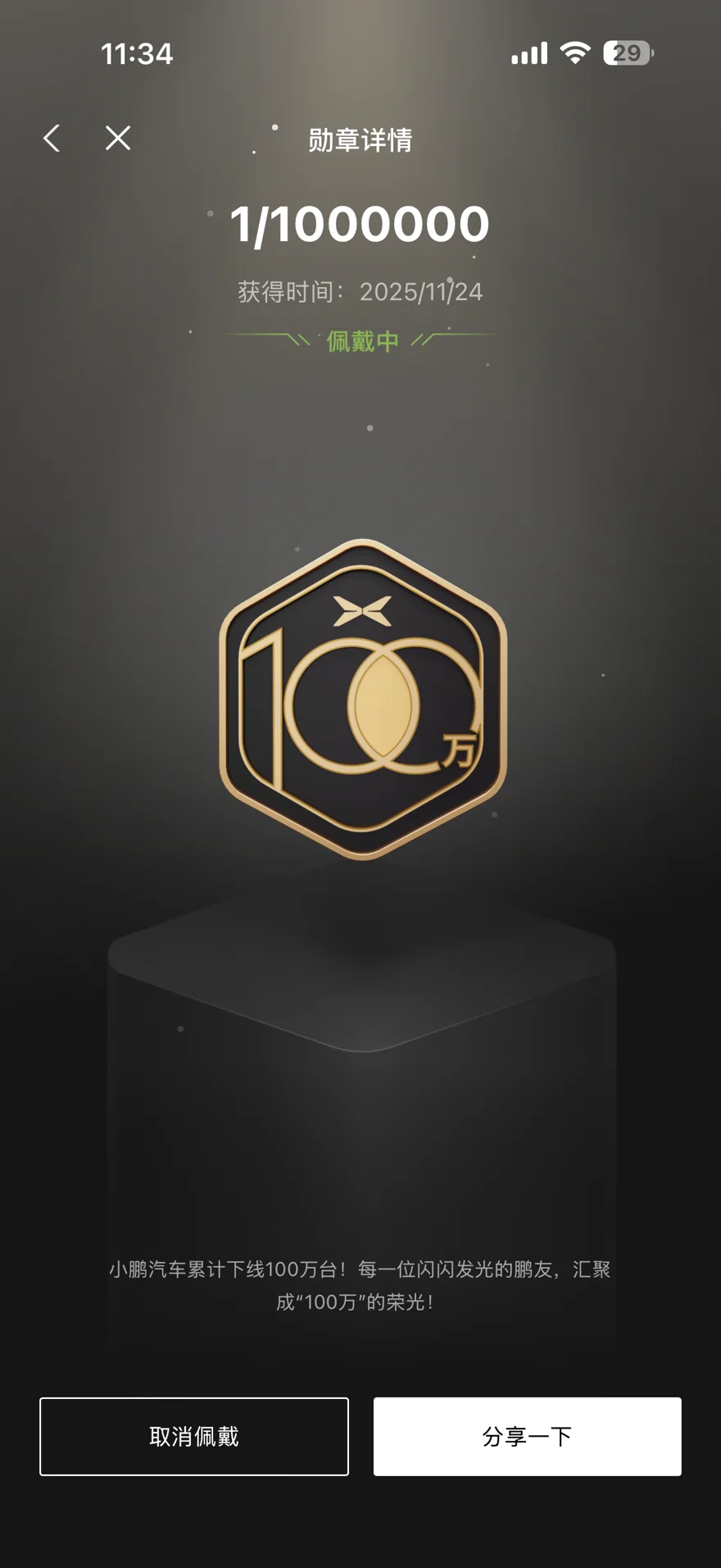 特别喜欢收藏勋章,一旦遇到好看的勋章就想立刻拥有,佩戴1/100万分之一的勋章也是同样的理由,车标好看还有里程碑的意义,鹏友圈又扩大了!