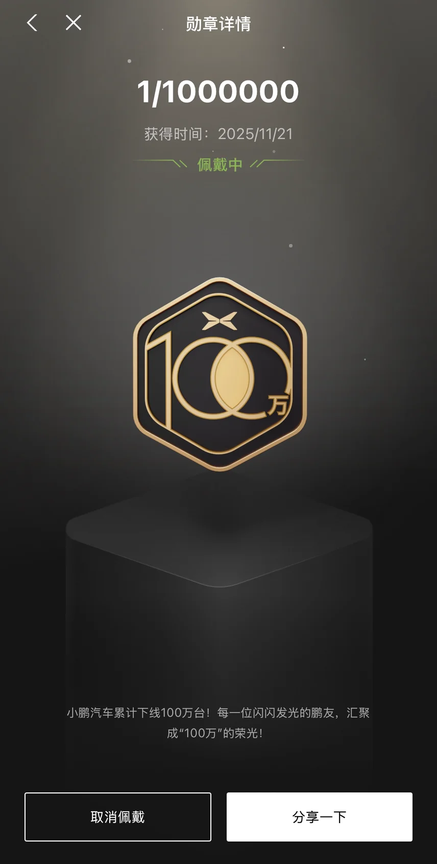 九个多月获得15个勋章,小鹏这个活动还挺有成就感。勋章涉及方方面面的功能进取。目前觉得100万台纪念勋章最有纪念意义,
