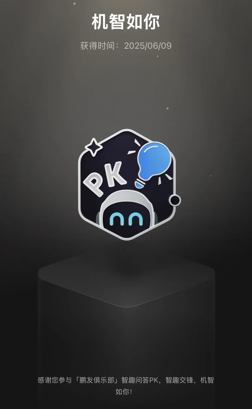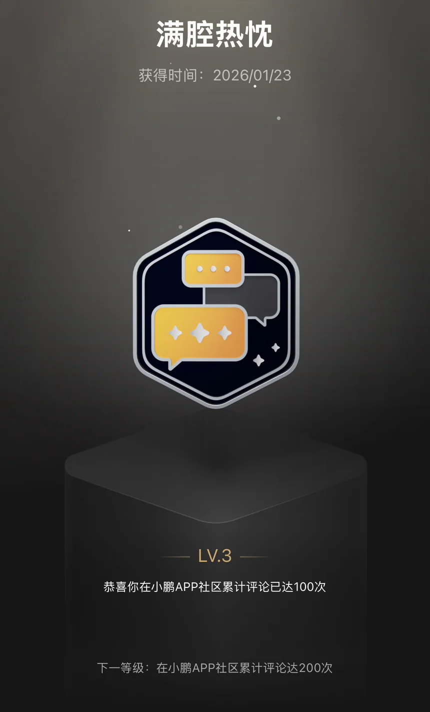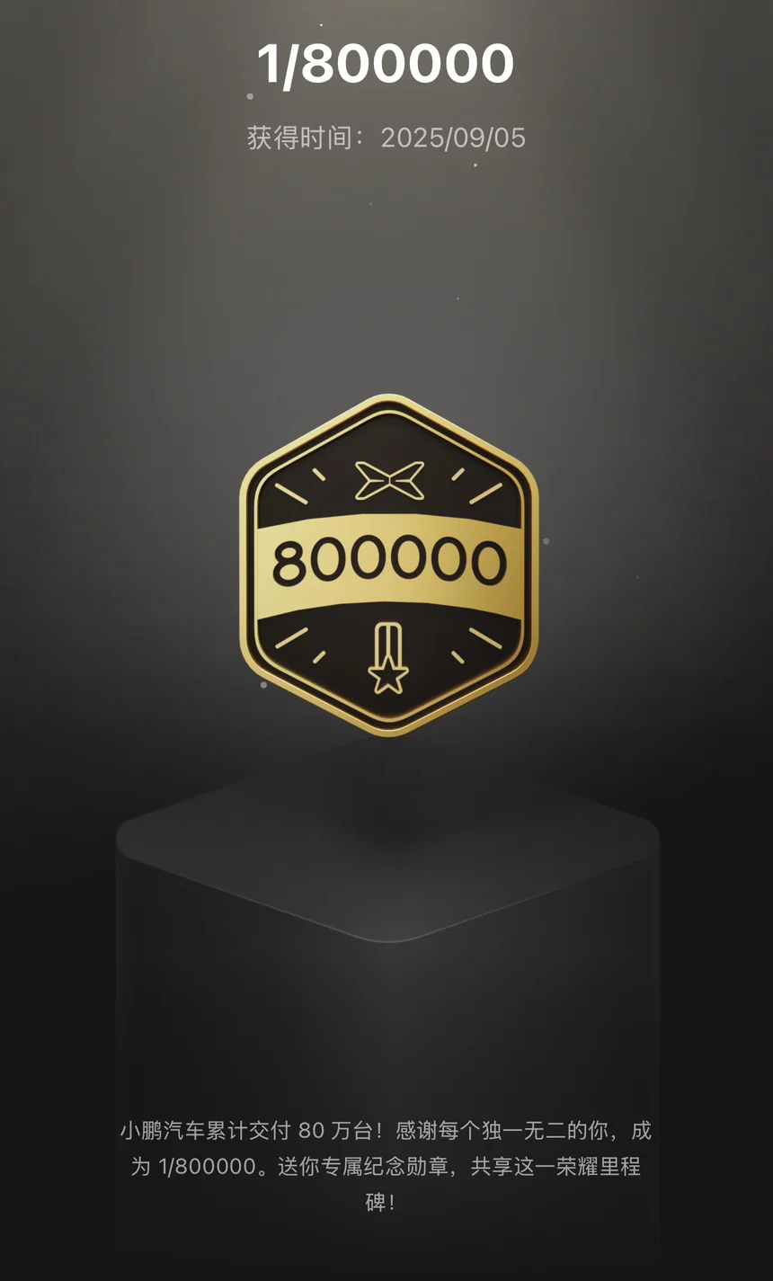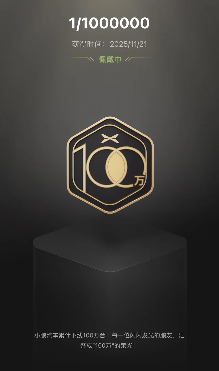 首先要重磅介绍我最最珍视的 【1/1000000 勋章】 🚀!这枚勋章可太有分量了!它不仅仅是一个图标,更是小鹏汽车“走”进百万级车企俱乐部的见证者!👑 戴上它,仿佛就能感受到百万鹏友汇聚在一起的力量,这是一种“百万征程,幸得有您”的归属感,沉甸甸的,超自豪!💪