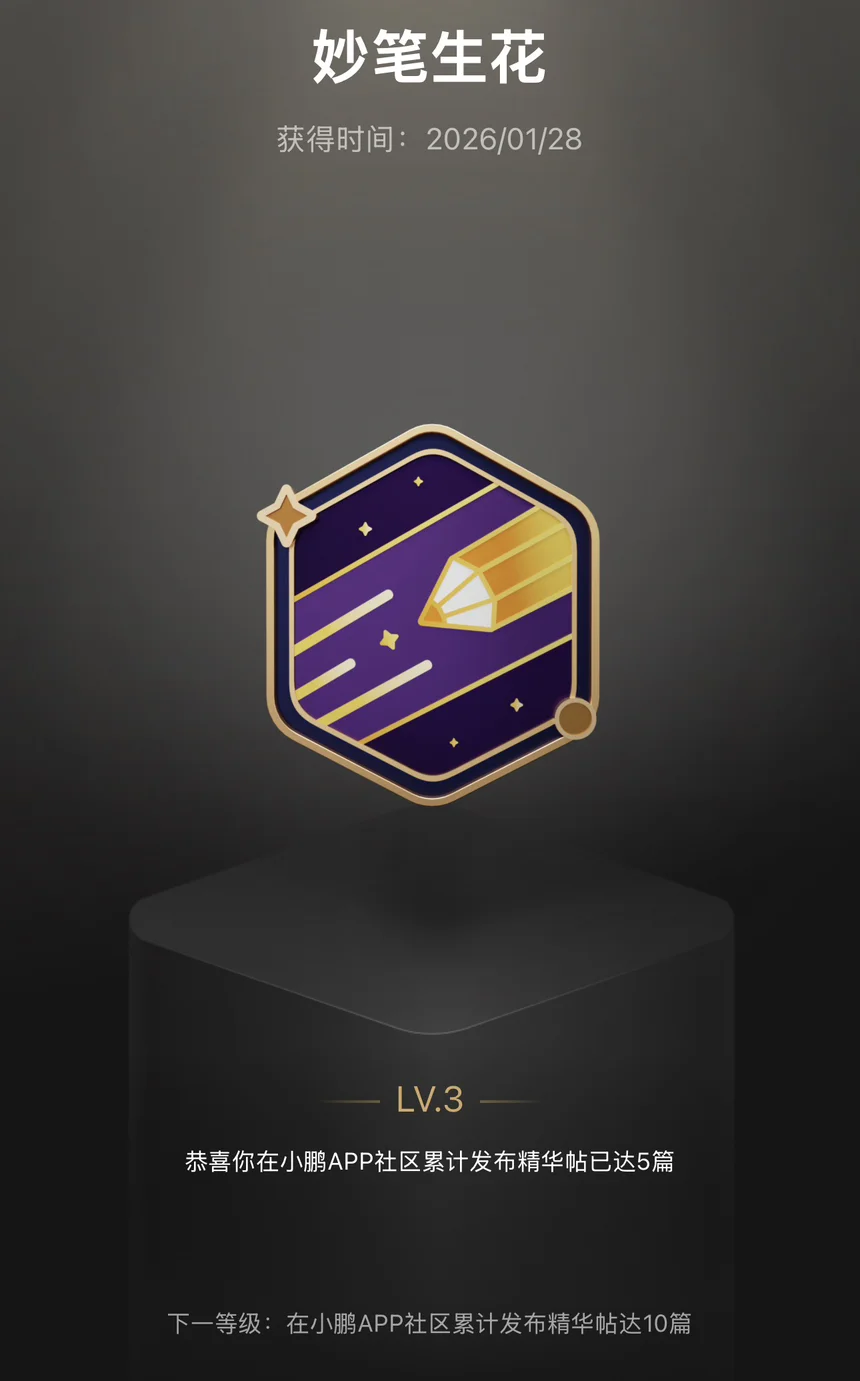 其次必须要提的就是 【妙笔生花勋章】 ✍️🌸啦!这枚勋章是我在社区里“笔耕不辍”的最好证明!为了拿到它,我愣是憋出了5篇精华帖!🎉 从用车技巧到自驾游记,每一篇都是心血结晶。这枚勋章挂着,既是荣誉也是鞭策,提醒我要“文思泉涌不停歇,再接再厉创佳作”!📚