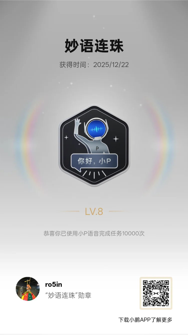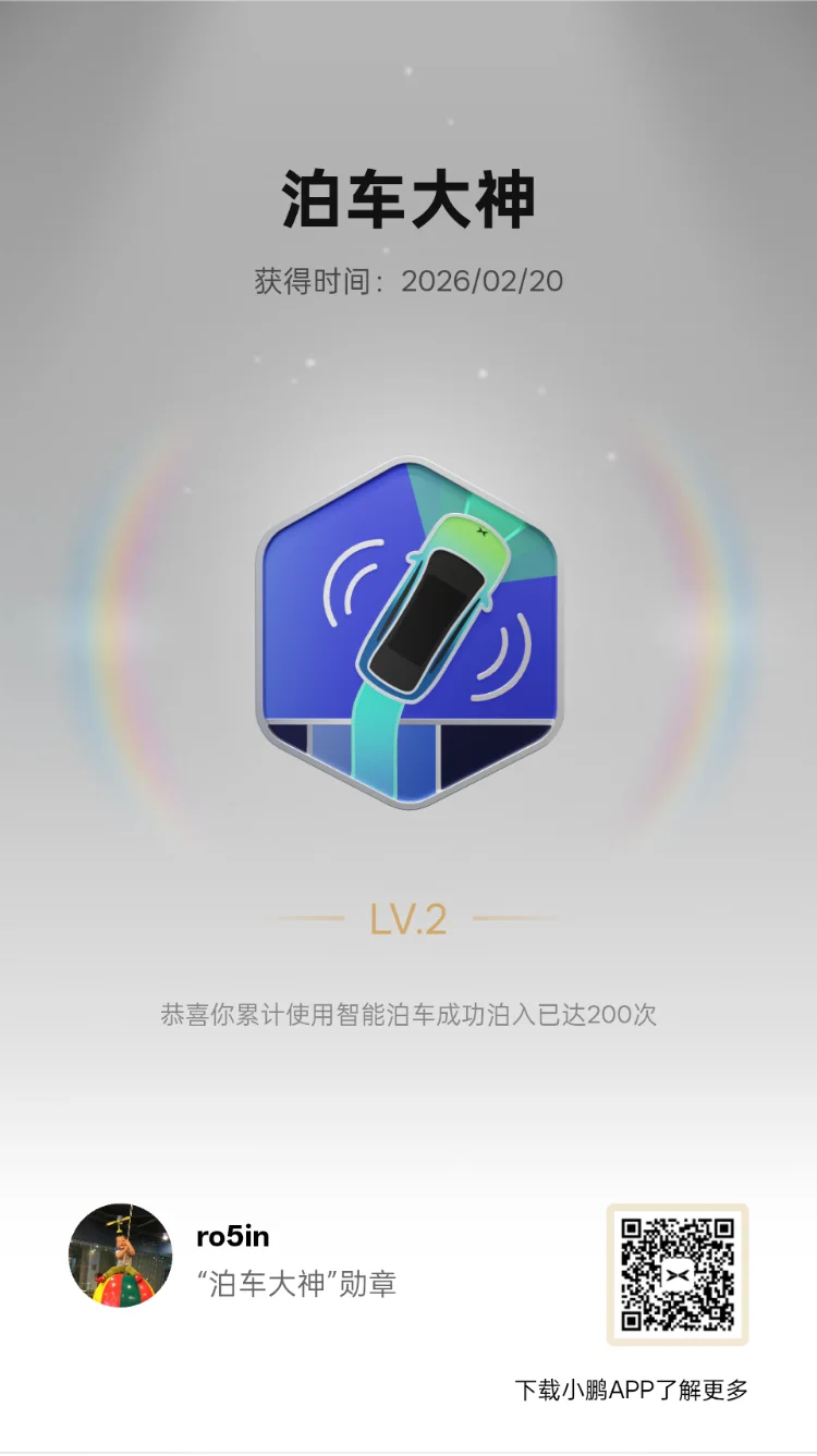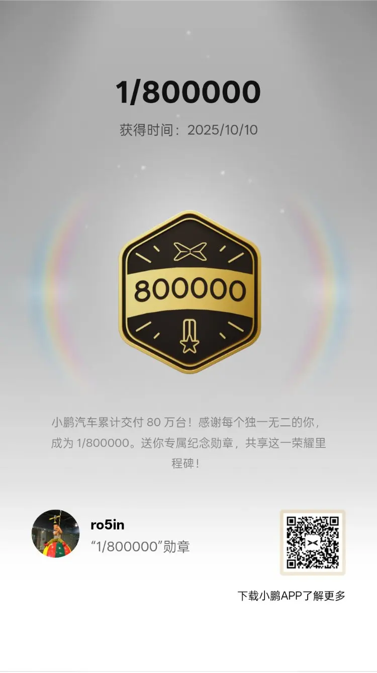 如今我也获得了百万分之一的成就,祝小鹏汽车越来越好,智驾越来越棒