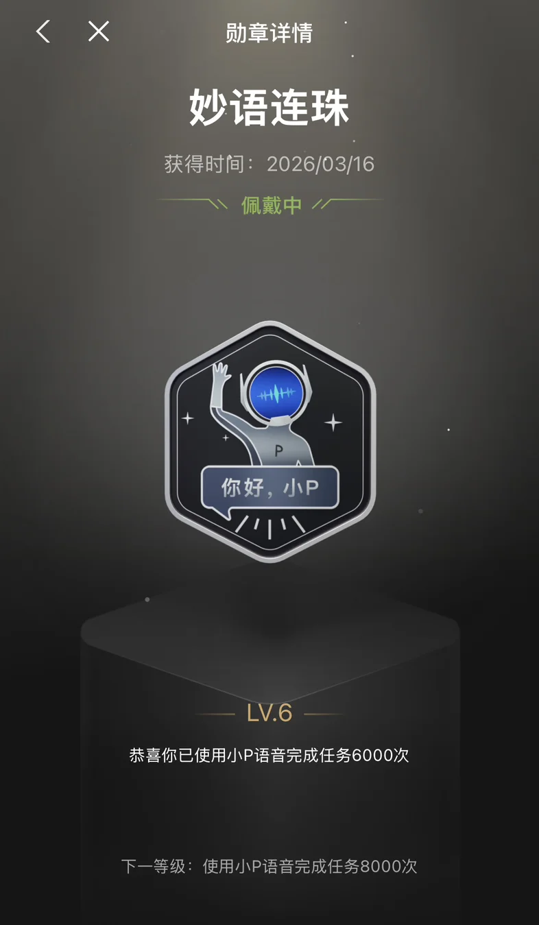 #晒晒我的勋章# 目前已经收集了17款勋章,每一枚都是我和小鹏同行的见证!在所有勋章里,我最偏爱也一直佩戴的是「妙语连珠」LV.6——累计6000次唤醒小P,从导航、控车到闲聊解闷,它早已是我驾驶时最默契的伙伴,让出行更轻松便捷。另外「智驾先锋」LV.4也陪伴我走过了4000km的辅助驾驶里程,安全感满满。希望未来能解锁更多勋章,也期待错过的限定款能有返场机会!
