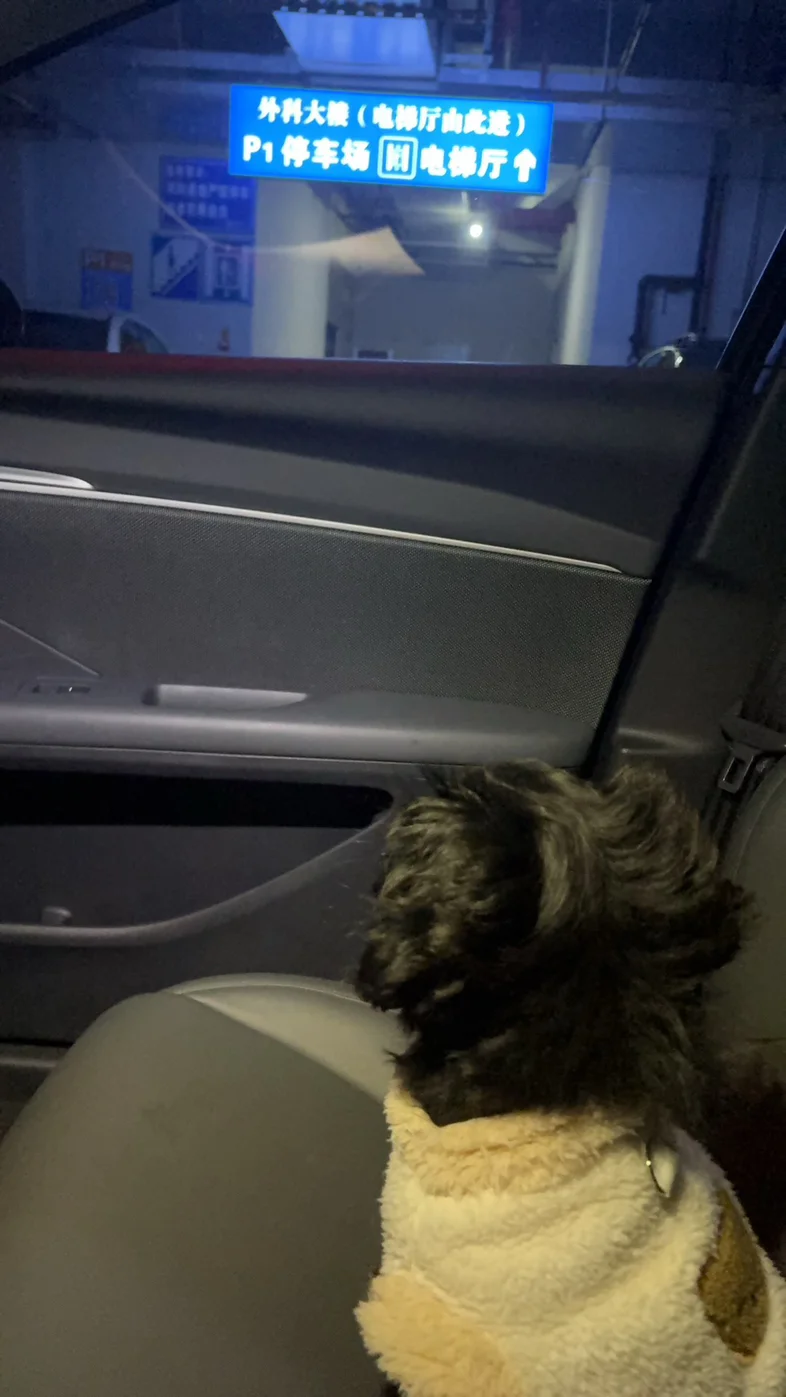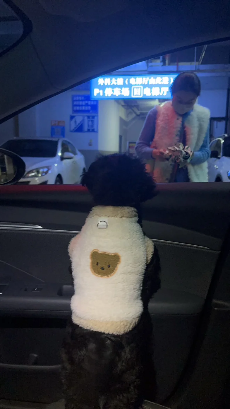 圆滚滚的小黑狗穿着软乎乎的小熊绒衣,扒着车窗眼巴巴望着外面,小背影都透着满满的期待感,像个等主人接放学的小朋友,瞬间把心都萌化了。