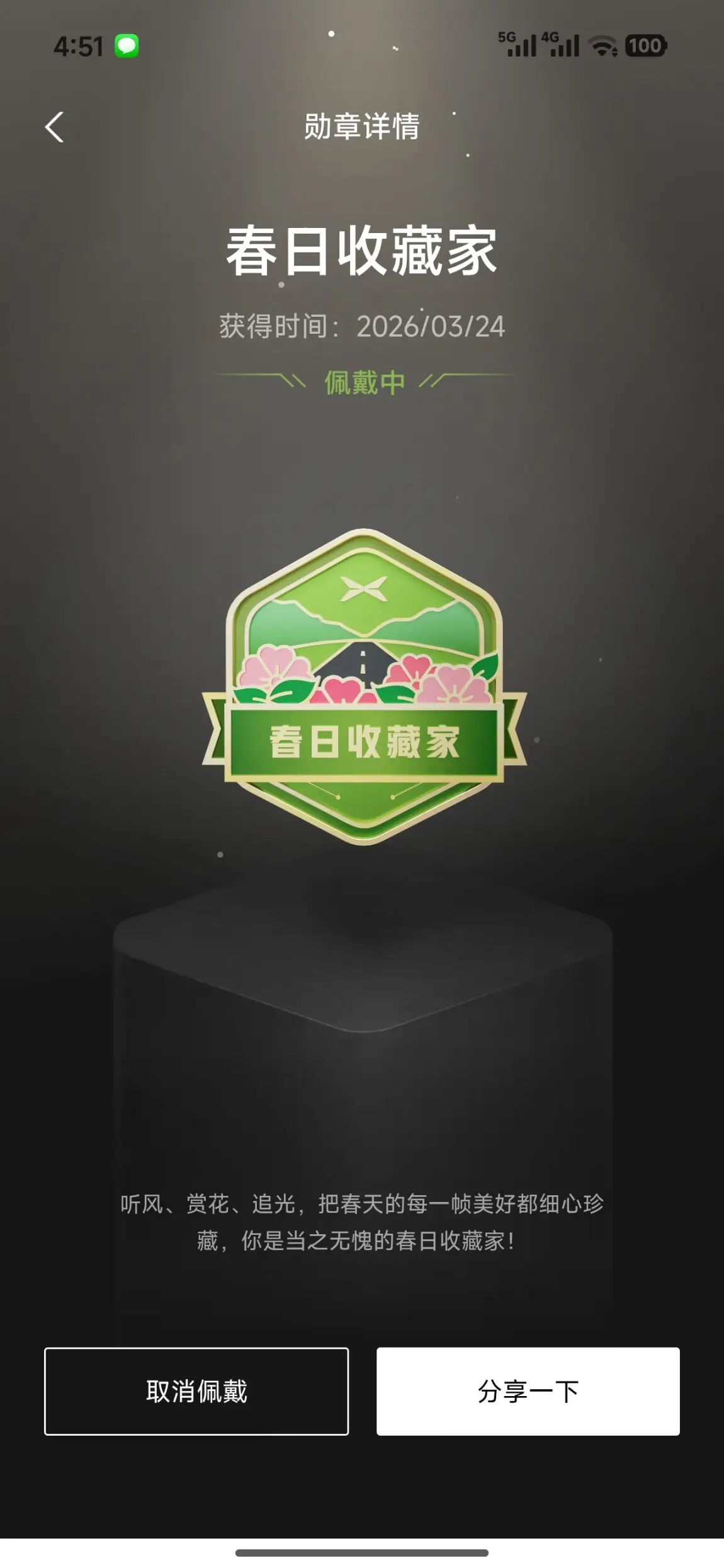 这是我最新解锁的勋章,在2026年的春天,我带着小P穿梭于花海与山野,用镜头记录下每一缕春风与繁花。听风、赏花、追光,把春天的美好细心珍藏,也终于成为了当之无愧的春日收藏家。这枚带着樱花与远山的勋章,是春天给我的最好馈赠。