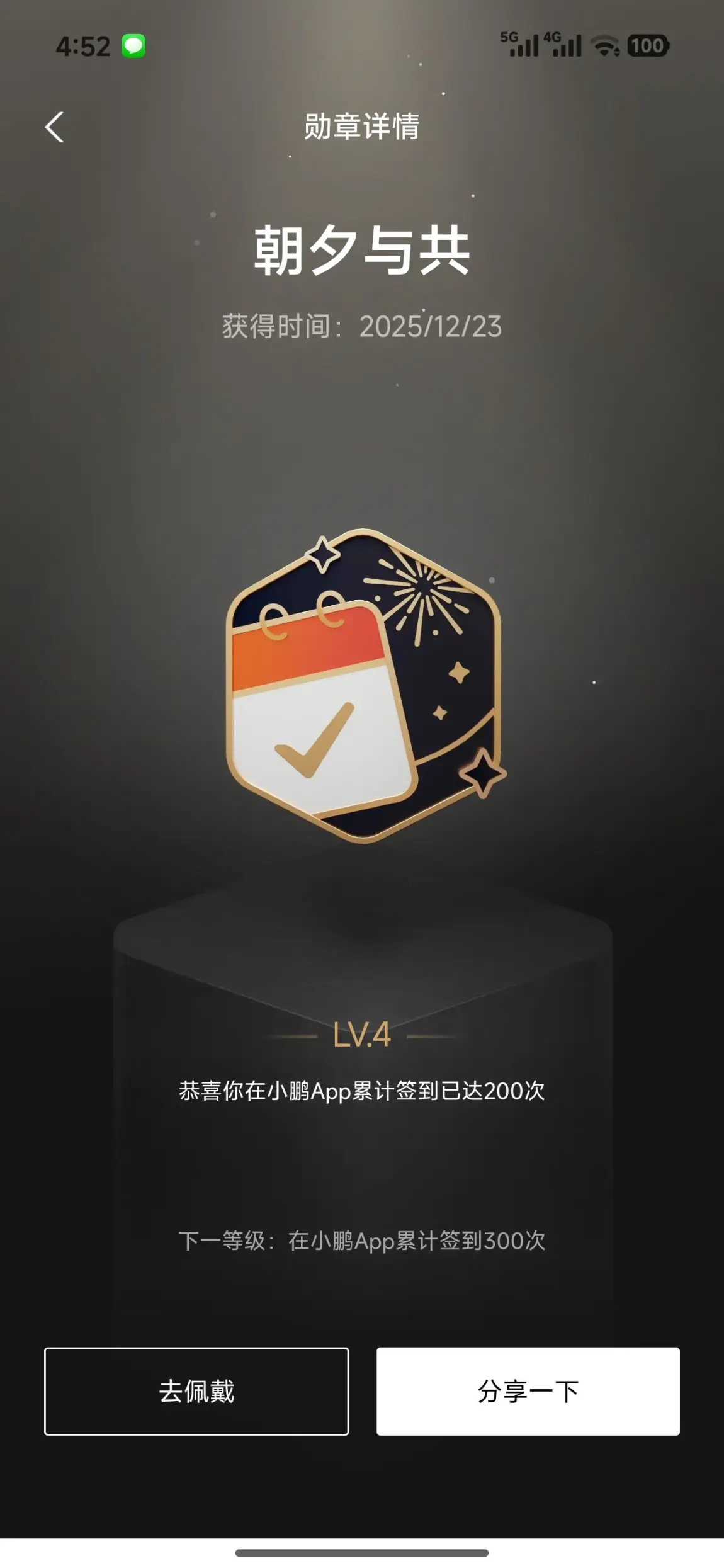 200天的连续签到,是我对小鹏App最执着的陪伴。从提车那天起,每天打开App打卡、看资讯、逛社区,已经成为了我的习惯。这枚日历与烟花的勋章,见证了我与小鹏朝夕相伴的时光,也让我更加期待下一个300天的约定。