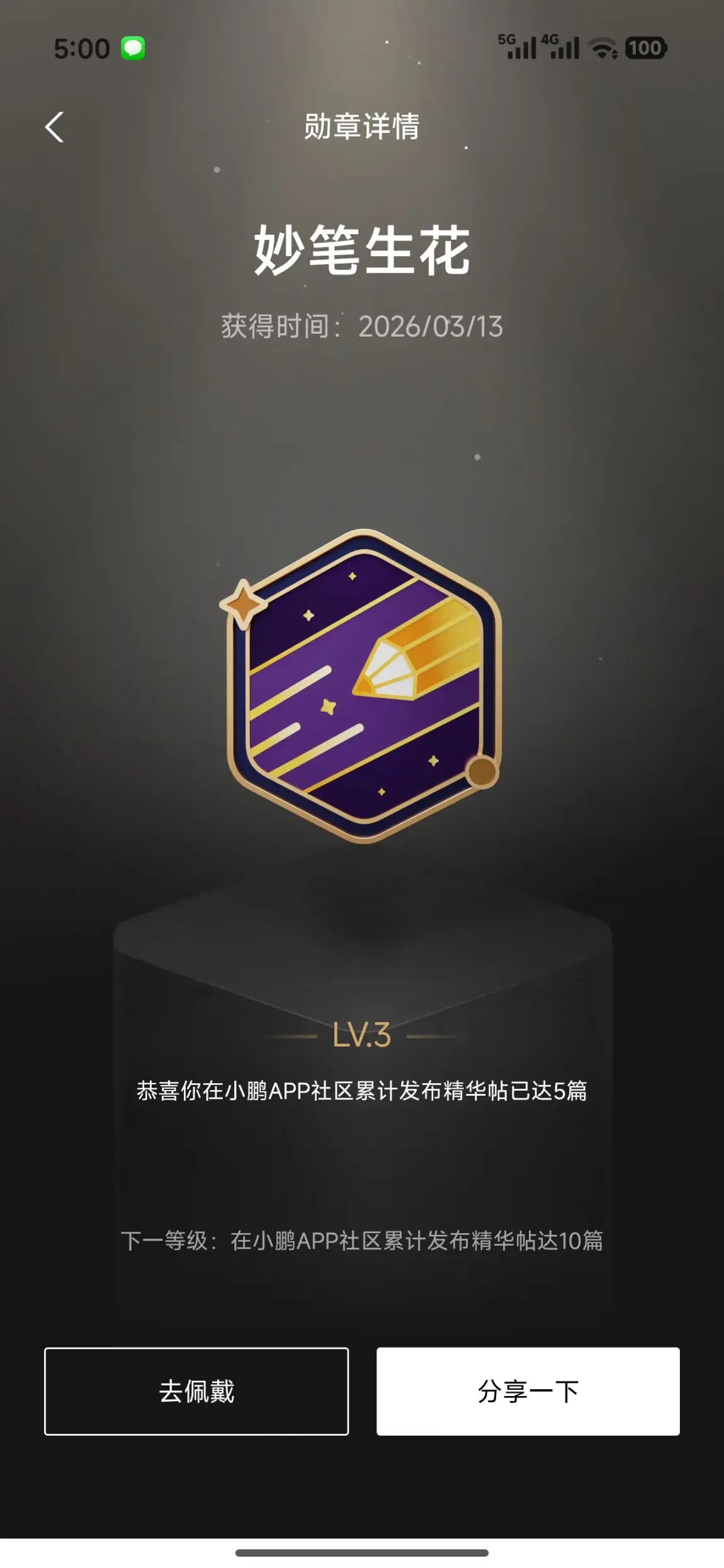 从第一篇帖子的青涩,到如今累计5篇精华帖,这枚星空下的金色铅笔勋章,是我在社区笔耕不辍的证明。分享MONA 03的实用好物、记录自驾的沿途风景、吐槽用车的小插曲……每一次敲击键盘,都是与鹏友们的真诚交流。下一个目标,是冲击10篇精华帖,让更多人看见我与小P的故事。
