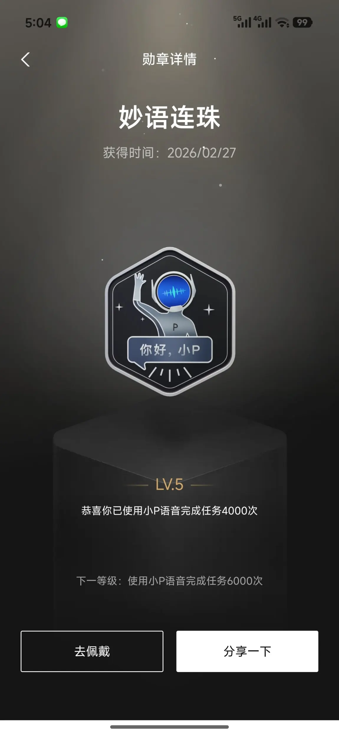 “你好,小P!”——这是我和小P最熟悉的对话。4000次语音指令,从导航、听歌到控制空调,小P早已成为我生活中不可或缺的伙伴。这枚带着声波图案的勋章,是我与小P默契的证明,也是智能座舱给我的便捷与温暖。