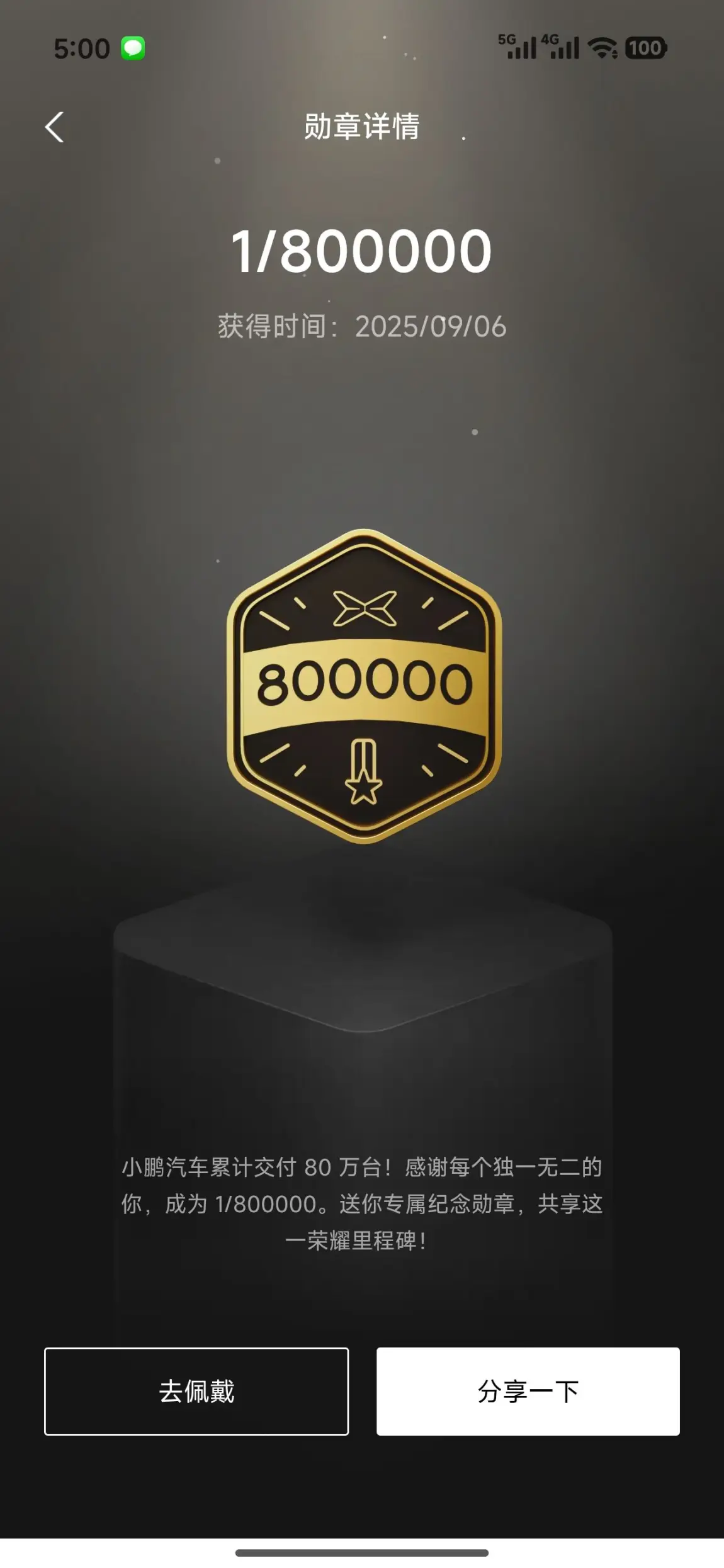 这是我最珍视的一枚勋章,它代表着我是小鹏80万车主中的一员。从2025年9月6日获得至今,它时刻提醒着我,我不仅是一位车主,更是小鹏成长的见证者。能成为这1/800000,与无数鹏友共享这份荣耀,是我与小鹏之间最特别的联结。