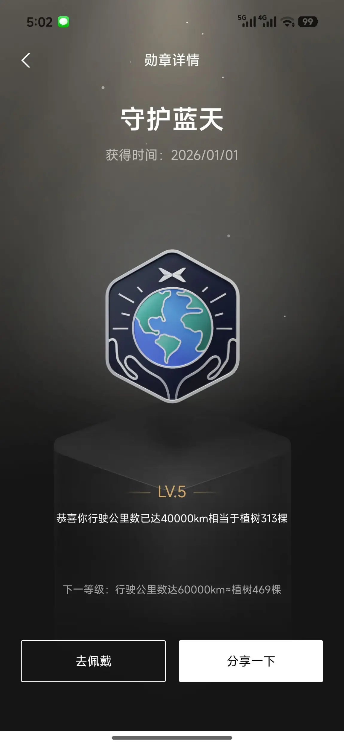 40000公里的行驶里程,相当于种下了313棵树。作为一名新能源车主,这枚守护地球的勋章,让我倍感自豪。每一次踩下电门,都是在为环保贡献力量;每一公里的行驶,都是在守护我们共同的蓝天。向着60000公里的目标前进,我要种下更多“绿色”。
